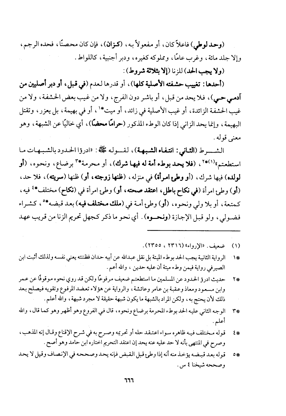 الشرط (الثاني: انتفاء الشبهة) لقوله - صَلَّى اللَّهُ عَلَيْهِ وَسَلَّمَ -: «ادرءوا الحدود بالشبهات ما استطعتم» (فلا يحد بوطء أمة له فيها شرك) ، أو محرمة برضاع ونحوه، (أو لولده) فيها شرك، (أو وطئ امرأة) في منزله (ظنها زوجته، أو) ظنها (سريته) فلا حد، (أو) وطئ امرأة (في نكاح باطل اعتقد صحته، أو) وطئ امرأة في (نكاح) مختلف فيه كمتعة، أو بلا ولي ونحوه، (أو) وطئ أمة في (ملك مختلف فيه) بعد قبضه كشراء فضولي ولو قبل الإجازة (ونحوه) . أي نحو ما ذكر كجهل تحريم الزنا من قريب عهد