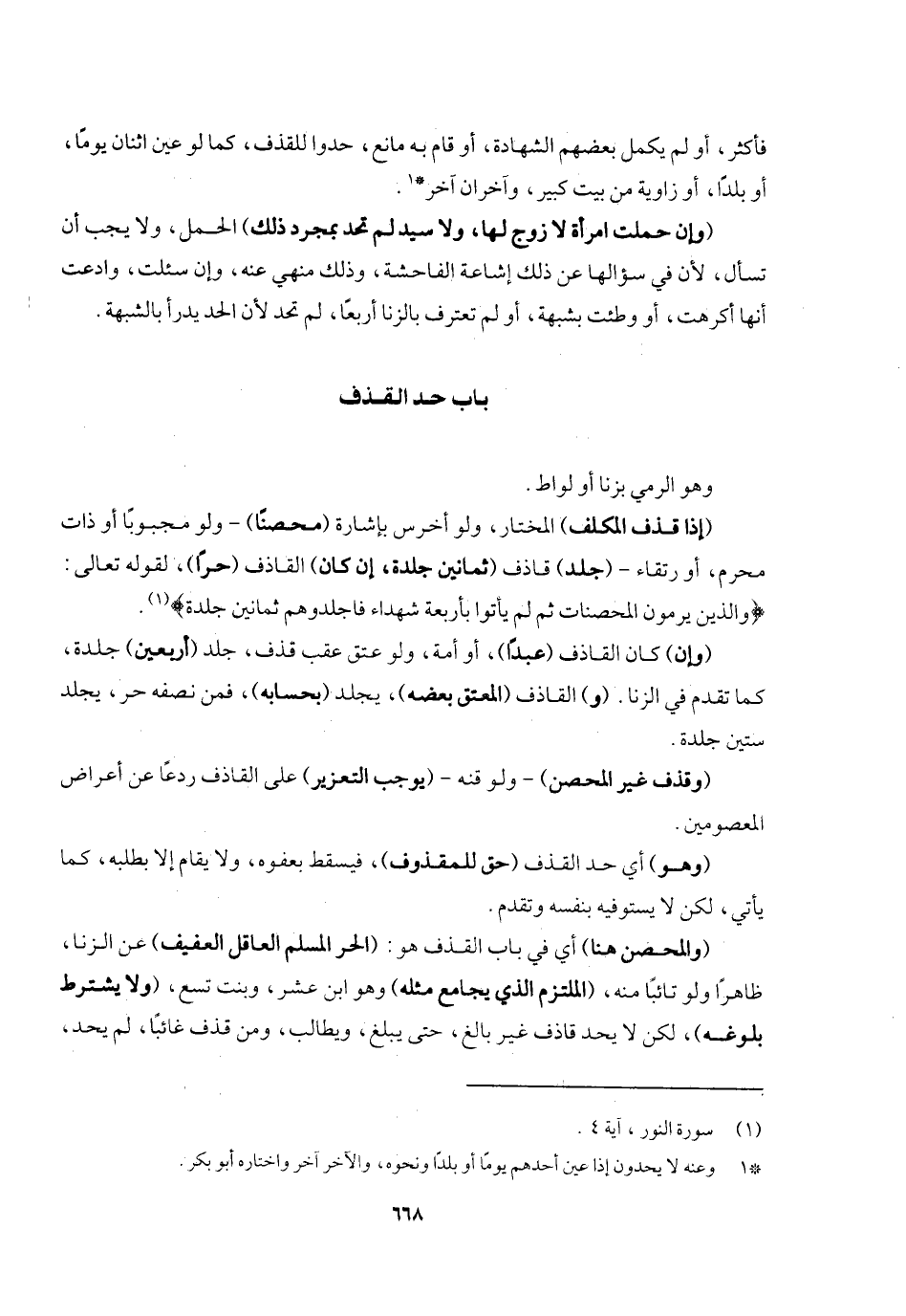 تعالى: {وَالَّذِينَ يَرْمُونَ الْمُحْصَنَاتِ ثُمَّ لَمْ يَأْتُوا بِأَرْبَعَةِ شُهَدَاءَ فَاجْلِدُوهُمْ ثَمَانِينَ جَلْدَةً} [النور: ٤] (وإن) كان القاذف (عبدا) ، أو أمة ولو عتق عقب قذف جلد (أربعين) جلدة كما تقدم في الزنا. (و) القاذف (المعتق بعضه) يجلد (بحسابه) ، فمن نصفه حر يجلد ستين جلدة، (وقذف غير المحصن) ولو قنه (يوجب التعزير) على القاذف ردعا عن أعراض المعصومين، (وهو) أي حد القذف (حق للمقذوف) فيسقط بعفوه، ولا يقام إلا بطلبه، كما يأتي، لكن لا يستوفيه بنفسه وتقدم. (والمحصن هنا) أي في باب القذف هو: (الحر المسلم العاقل العفيف) عن الزنا ظاهرا ولو تائبا منه، (الملتزم الذي يجامع مثله) وهو ابن عشر وبنت تسع، (ولا يشترط بلوغه) لكن لا يحد قاذف غير بالغ حتى يبلغ ويطالب، ومن قذف غائبا لم يحد
