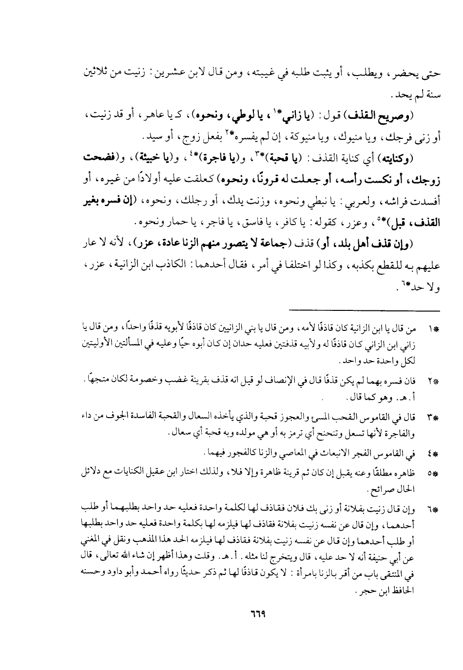 (وصريح القذف) قوله: يا زاني يا لوطي، ونحوه) كيا عاهر، أو قد زنيت، أو زنى فرجك، ويا منيوك، ويا منيوكة إن لم يفسره بفعل زوج أو سيد، (وكنايته) أي كناية القذف (يا قحبة) و (يا فاجرة) و (يا خبيثة) و (فضحت زوجك، أو نكست رأسه، أو جعلت له قرونا، ونحوه) كعلقت عليه أولادا من غيره، أو أفسدت فراشه ولعربي: يا نبطي ونحوه، وزنت يدك، أو رجلك ونحوه، (إن فسره بغير القذف قبل) وعزر كقوله: يا كافر يا فاسق يا فاجر يا حمار ونحوه.