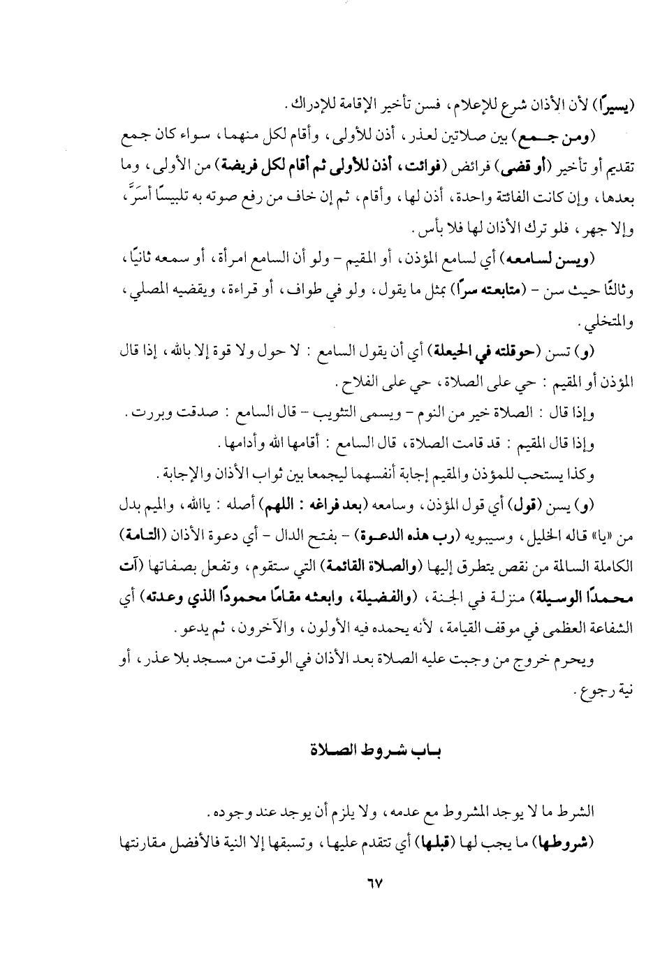 الكاملة السالمة من نقص يتطرق إليها (والصلاة القائمة) التي ستقوم وتفعل بصفاتها (آت محمدا الوسيلة) منزلة في الجنة (والفضيلة وابعثه مقاما محمودا الذي وعدته) أي الشفاعة العظمى في موقف القيامة؛ لأنه يحمده فيه الأولون والآخرون ثم يدعو. ويحرم خروج من وجبت عليه الصلاة بعد الأذان في الوقت من مسجد بلا عذر أو نية رجوع.