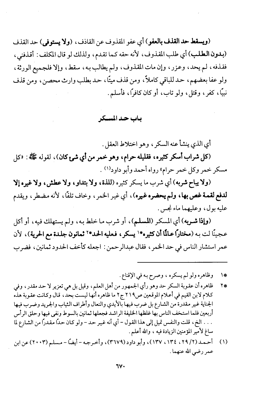 حرام، وهو خمر من أي شيء كان) ؛ لقوله - صَلَّى اللَّهُ عَلَيْهِ وَسَلَّمَ -: «كل مسكر خمر وكل خمر حرام» رواه أحمد وأبو داود. (ولا يباح شربه) أي شرب ما يسكر كثيره (للذة ولا بتداو ولا عطش ولا غيره، إلا لدفع لقمة غص بها ولم يحضره غيره) ، أي غير الخمر، وخاف تلفا لأنه مضطر، ويقدم عليه بول، وعليهما ماء نجس، (وإذا شربه) أي المسكر (المسلم) ، أو شرب ما خلط به ولم يستهلك فيه، أو أكل عجينا لت به (مختارا عالما أن كثيره يسكر، فعليه الحد ثمانون جلدة مع الحرية) ، لأن عمر استشار الناس في حد الخمرة، فقال عبد الرحمن: اجعله كأخف الحدود ثمانين، فضرب