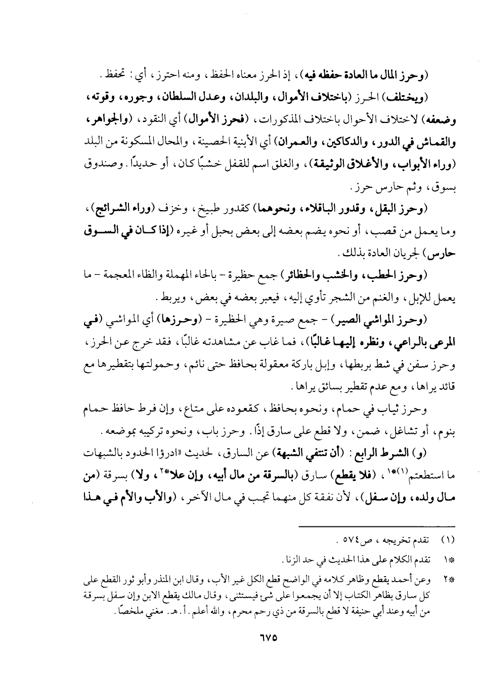 (وحرز المال ما العادة حفظه فيه) إذ الحرز معناه الحفظ، ومنه احترز، أي: تحفظ (ويختلف) الحرز (باختلاف الأموال والبلدان وعدل السلطان وجوره وقوته وضعفه) لاختلاف الأحوال باختلاف المذكورات (فحرز الأموال) أي النقود (والجواهر والقماش في الدور والدكاكين والعمران) أي الأبنية الحصينة والمحال المسكونة من البلد (وراء الأبواب والأغلاق الوثيقة) ، والغلق اسم للقفل خشبا كان أو حديدا. وصندوق بسوق وثم حارس حرز (وحرز البقل وقدور الباقلاء ونحوهما) كقدور طبيخ وخزف (وراء الشرائج) وهي ما يعمل من قصب، أو نحوه يضم بعضه إلى بعض بحبل أو غيره (إذا كان في السوق حارس) لجريان العادة بذلك (وحرز الحطب والخشب والحظائر) جمع حظيرة - بالحاء المهملة والظاء المعجمة - ما يعمل للإبل والغنم من الشجر تأوي إليه فيعبر بعضه في بعض ويربط، (وحرز المواشي الصير) جمع صيرة وهي الحظيرة (وحرزها) أي المواشي (في المرعى بالراعي ونظره إليها غالبا) فما غاب عن مشاهدته غالبا فقد خرج عن الحرز، وحرز سفن في شط بربطها وإبل باركة معقولة بحافظ حتى نائم، وحمولتها بتقطيرها مع قائد يراها ومع عدم تقطير بسائق يراها، وحرز ثياب في حمام ونحوه بحافظ، كقعوده على متاع، وإن فرط حافظ حمام بنوم أو تشاغل ضمن ولا قطع على سارق إذا. وحرز باب ونحوه تركيبه بموضعه