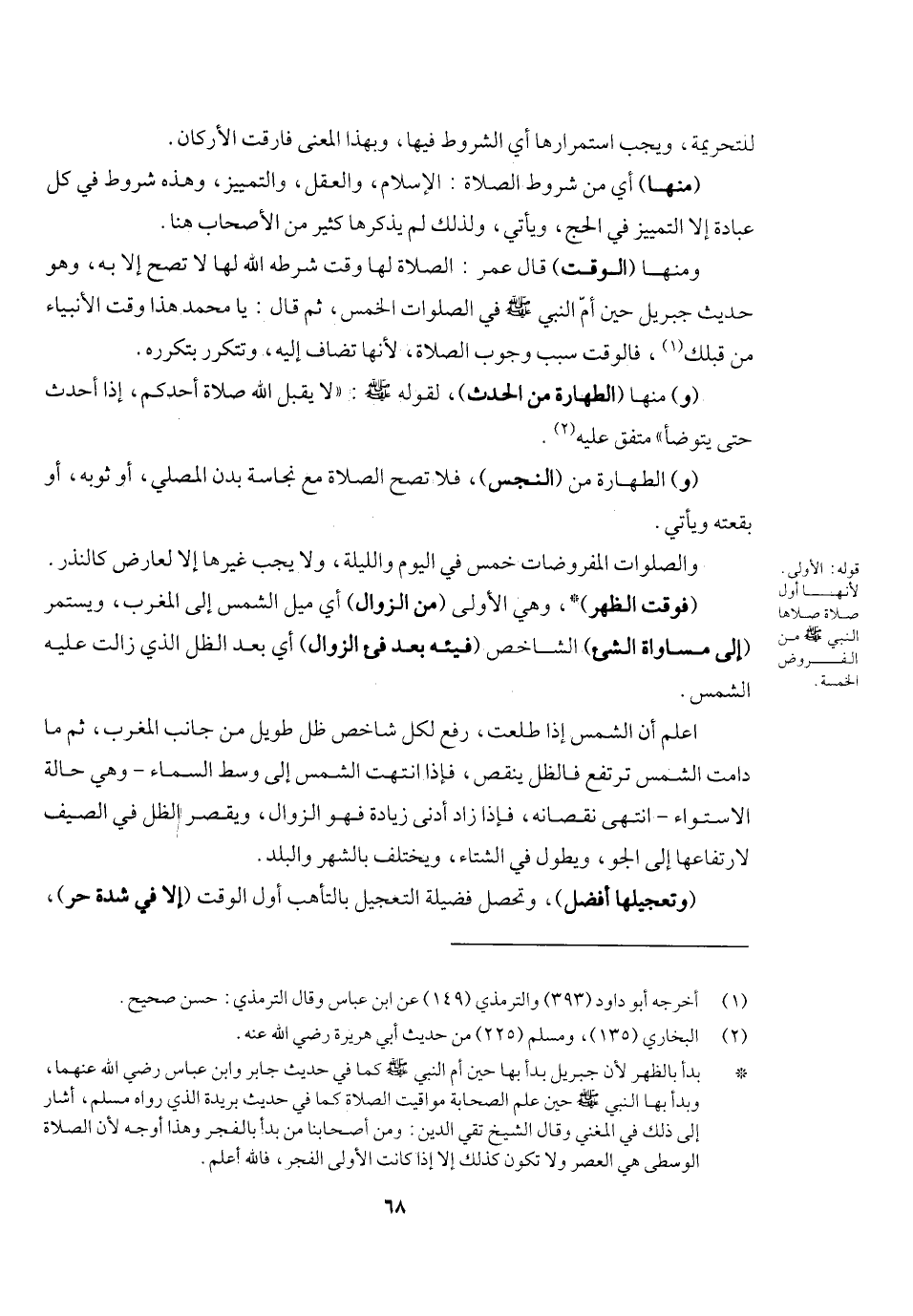 (و) منها (الطهارة من الحدث) لقوله - صَلَّى اللَّهُ عَلَيْهِ وَسَلَّمَ -: «لا يقبل الله صلاة أحدكم إذا أحدث حتى يتوضأ» متفق عليه. (و) الطهارة من (النجس) فلا تصح الصلاة مع نجاسة بدن المصلي أو ثوبه أو بقعته ويأتي. والصلوات المفروضات خمس في اليوم والليلة، ولا يجب غيرها إلا لعارض كالنذر.