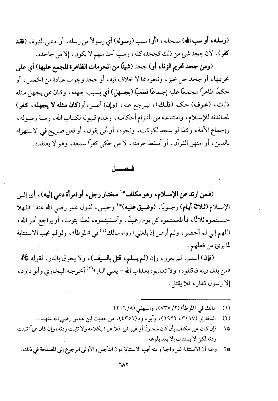 فصل (فمن ارتد عن الإسلام وهو مكلف مختار رجل، أو امرأة دعي إليه) أي إلى الإسلام (ثلاثة أيام) وجوبا، (وضيق عليه) ، وحبس لقول عمر - رَضِيَ اللَّهُ عَنْهُ -: " فهلا حبستموه ثلاثا، فأطعمتموه كل يوم رغيفا وأسقيتموه لعله يتوب أو يراجع أمر الله، اللهم إني لم أحضر ولم أرض إذ بلغني " رواه مالك في " الموطأ " ولو لم تجب الاستتابة لما برئ من فعلهم، (فإن) أسلم لم يعزر، وإن (لم يسلم قتل بالسيف) ، ولا يحرق بالنار لقوله - صَلَّى اللَّهُ عَلَيْهِ وَسَلَّمَ -: «من بدل دينه فاقتلوه، ولا تعذبوه بعذاب الله - يعني النار» أخرجه البخاري وأبو داود، إلا رسول كفار، فلا يقتل