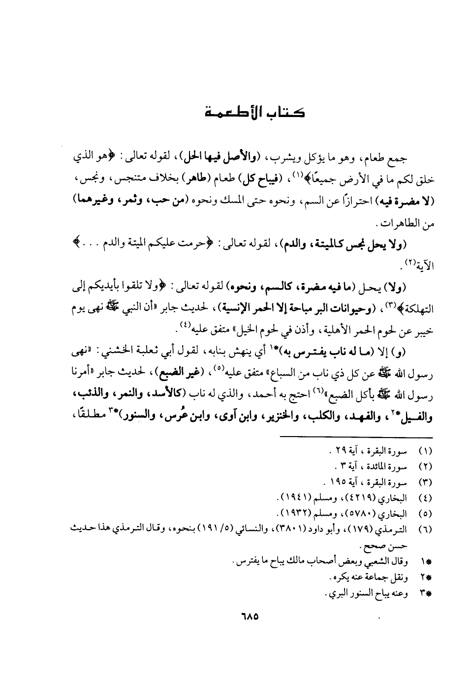 . جمع طعام، وهو ما يؤكل ويشرب، (والأصل فيها الحل) لِقَوْلِهِ تَعَالَى: {هُوَ الَّذِي خَلَقَ لَكُمْ مَا فِي الأَرْضِ جَمِيعًا} [البقرة: ٢٩] ، (فيباح كل) طعام (طاهر) بخلاف متنجس ونجس، (لا مضرة فيه) احترازا عن السم ونحوه حتى المسك ونحوه (من حب وثمر وغيرهما) من الطاهرات. (ولا يحل نجس كالميتة والدم) ؛ لِقَوْلِهِ تَعَالَى: {حُرِّمَتْ عَلَيْكُمُ الْمَيْتَةُ وَالدَّمُ} [المائدة: ٣] . . . الآية، (ولا) يحل (ما فيه مضرة، كالسم ونحوه) ؛ لِقَوْلِهِ تَعَالَى: {وَلا تُلْقُوا بِأَيْدِيكُمْ إِلَى التَّهْلُكَةِ} [البقرة: ١٩٥] ، (وحيوانات البر مباحة إلا الحمر الأنسية) ؛ لحديث جابر «أن النبي - صَلَّى اللَّهُ عَلَيْهِ وَسَلَّمَ - نهى يوم خيبر عن لحوم الحمر الأهلية وأذن في لحوم الخيل» متفق عليه.