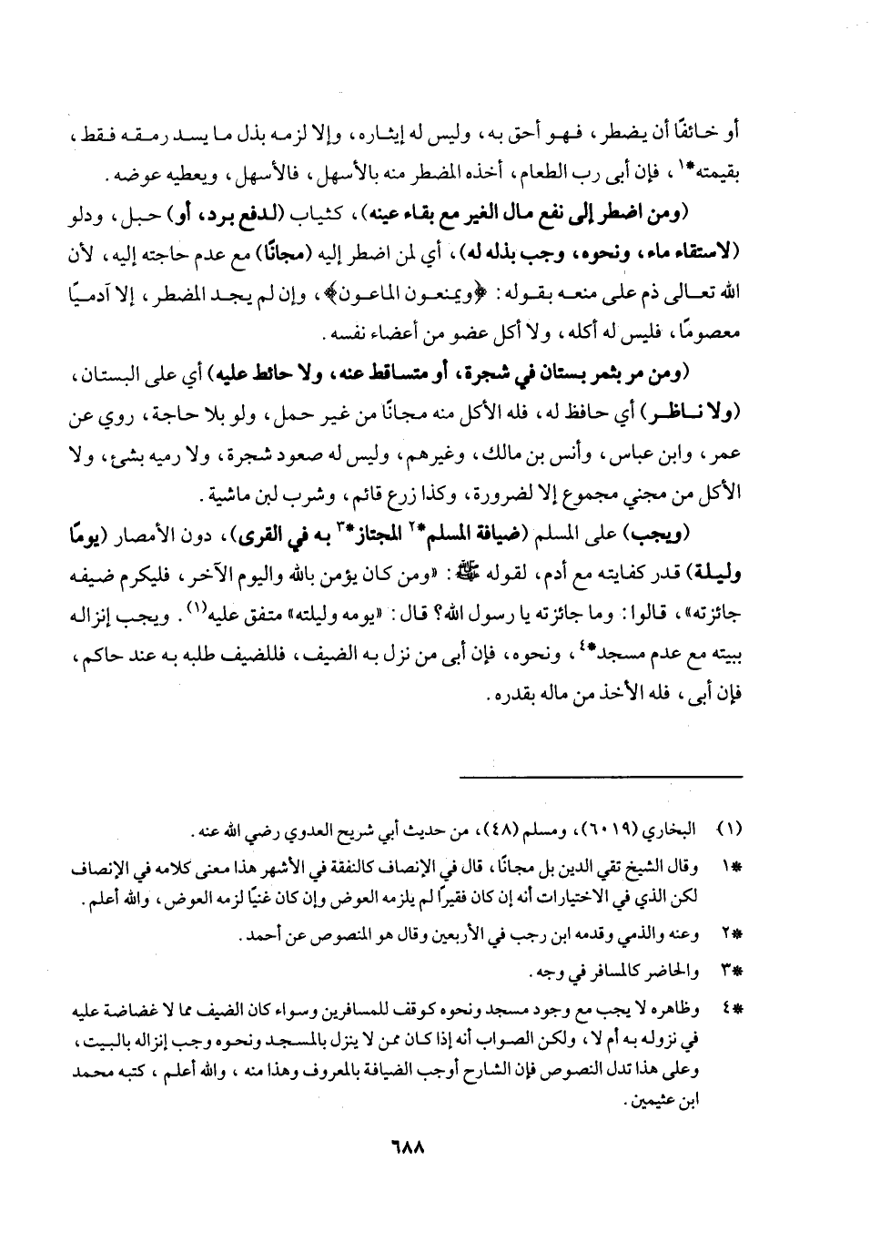 (ويجب) على المسلم (ضيافة المسلم المجتاز به في القرى) دون الأمصار (يوما وليلة) قدر كفايته مع آدم، لقوله - صَلَّى اللَّهُ عَلَيْهِ وَسَلَّمَ -: «من كان يؤمن بالله واليوم الآخر فليكرم ضيفه جائزته، قالوا: وما جائزته يا رسول الله؟ قال: يومه وليلته» متفق عليه. ويجب إنزاله ببيته مع عدم مسجد ونحوه، فإن أبى من نزل به الضيف، فللمضيف طلبه به عند حاكم، فإن أبى فله الأخذ من ماله بقدره.
