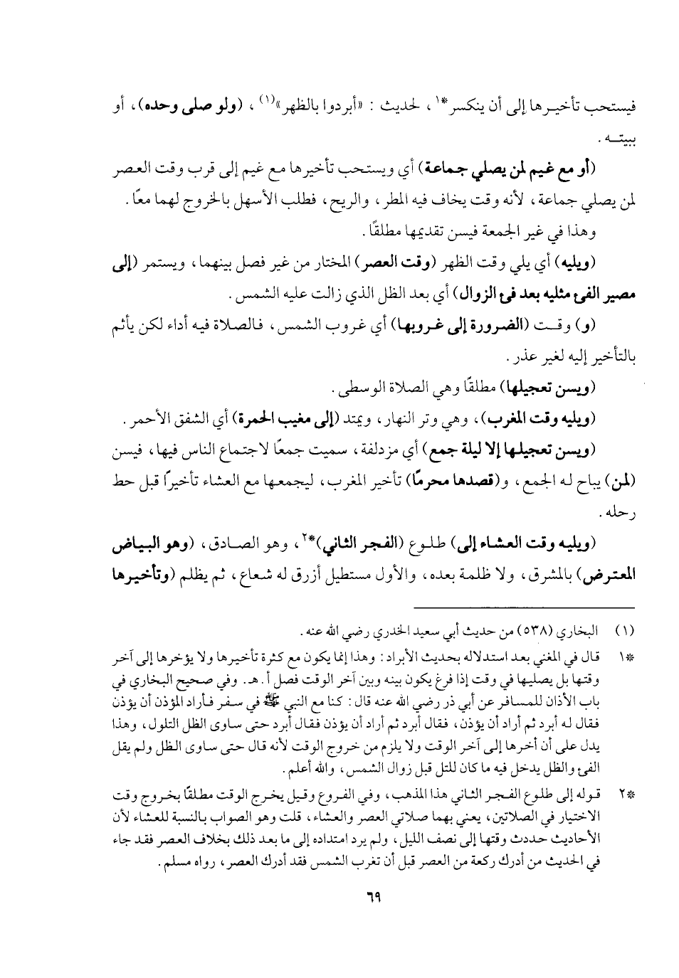 فيستحب تأخيرها إلى أن ينكسر لحديث: «أبردوا بالظهر» ، (ولو صلى وحده) أو في بيته (أو مع غيم لمن يصلي جماعة) أي ويستحب تأخيرها مع غيم إلى قرب وقت العصر لمن يصلي جماعة؛ لأنه وقت يخاف فيه المطر والريح فطلب الأسهل بالخروج لهما معا وهذا في غير الجمعة فيسن تقديمها مطلقا.