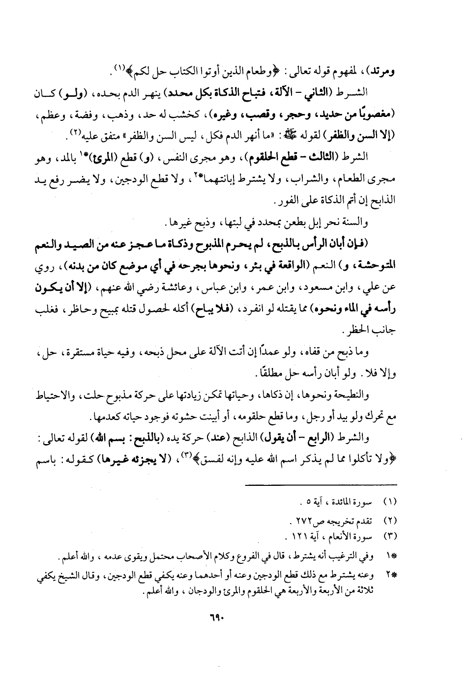 الشرط (الثالث - قطع الحلقوم) وهو مجرى النفس، (و) قطع (المريء) بالمد، وهو مجرى الطعام والشراب، ولا يشترط إبانتهما، ولا قطع الودجين، ولا يضر رفع يد الذابح إن أتم الذكاة على الفور، والسنة نحر إبل بطعن بمحدد في لبتها وذبح غيرها، [ (فإن أبان الرأس بالذبح لم يحرم المذبوح] وذكاة ما عجز عنه من الصيد والنعم المتوحشة و) النعم (الواقعة في بئر ونحوها بجرحه في أي موضع كان من بدنه) ، روي عن علي وابن مسعود وابن عمر وابن عباس وعائشة - رَضِيَ اللَّهُ عَنْهُمْ -، (إلا أن يكون رأسه في الماء ونحوه) مما يقتله لو انفرد، (فلا يباح) أكله لحصول قتله بمبيح وحاظر، فغلب جانب الحظر، وما ذبح من قفاه ولو عمدا إن أتت الآلة على محل ذبحه وفيه حياة مستقرة حل، وإلا فلا. ولو أبان رأسه حل مطلقا، والنطيحة ونحوها إن ذكاها وحياتها تمكن زيادتها على حركة مذبوح حلت، والاحتياط مع تحرك ولو بيد أو رجل، وما قطع حلقومه، أو أبينت حشوته فوجود حياته كعدمها.