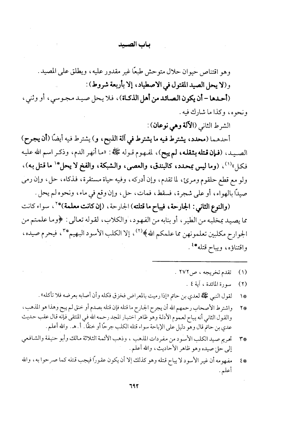 . وهو اقتناص حيوان حلال متوحش طبعا غير مقدور عليه، ويطلق على المصيد، (ولا يحل الصيد المقتول في الاصطياد إلا بأربعة شروط) :