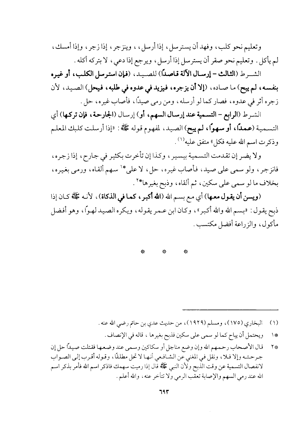 وتعليم نحو كلب وفهد أن يسترسل إذا أرسل، وينزجر إذا زجر، وإذا أمسك لم يأكل. وتعليم نحو صقر أن يسترسل إذا أرسل ويرجع إذا دعي لا بترك أكله.