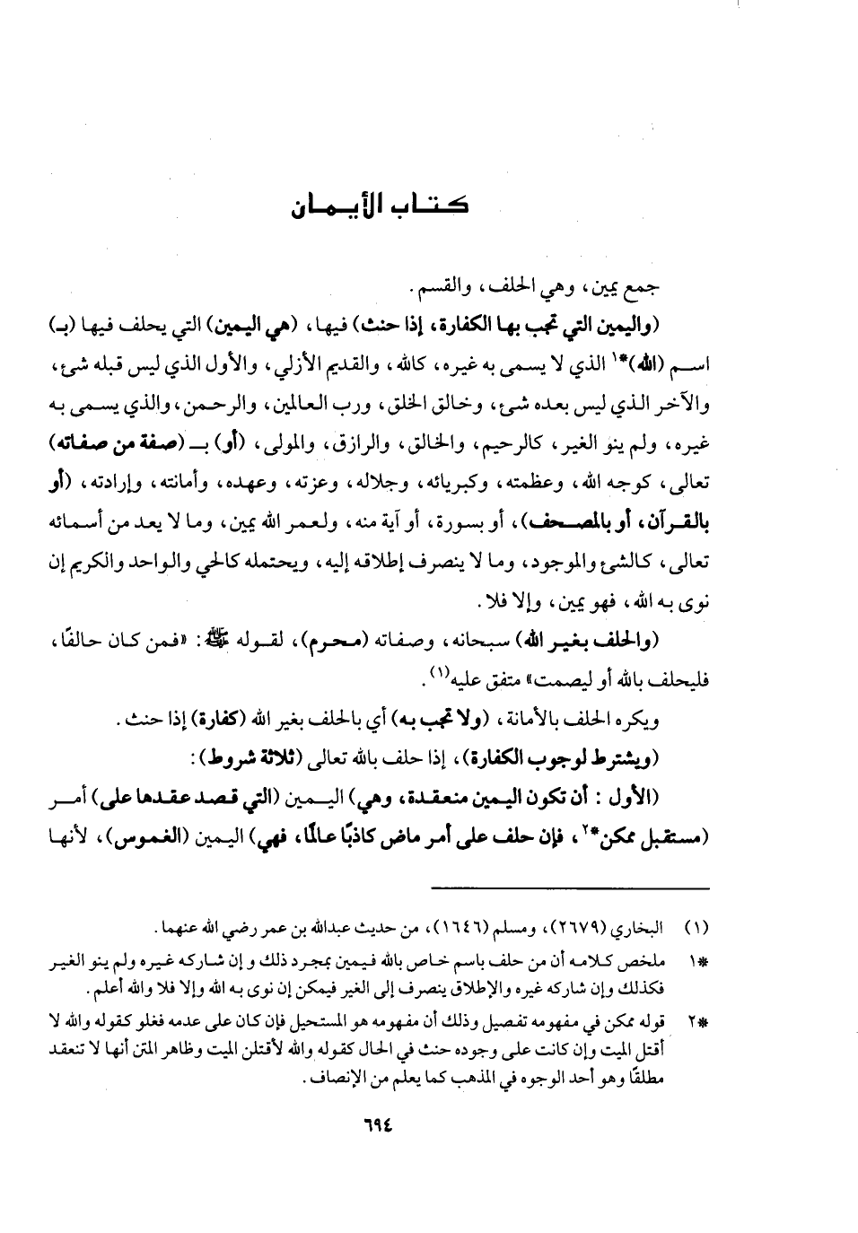 . جمع يمين، وهو الحلف والقسم. (واليمين التي تجب بها الكفارة إذا حنث) فيها (هي اليمين) التي يحلف فيها (بـ) اسم (الله) الذي لا يسمى به غيره، كالله، والقديم الأزلي، والأول الذي ليس قبله شيء، والآخر الذي ليس بعده شيء، وخالق الخلق، ورب العالمين، والرحمن، أو الذي يسمى به غيره، ولم ينو الغير كالرحيم والخالق والرازق والمولى، (أو) بـ (صفة من صفاته) تعالى، كوجه الله وعظمته وكبريائه وجلاله وعزته وعهده وأمانته وإرادته، (أو بالقرآن، أو بالمصحف) ، أو بسورة، أو آية منه، ولعمر الله يمين، وما لا يعد من أسمائه تعالى، كالشيء والموجود، وما لا ينصرف إطلاقه إليه، ويحتمله كالحي والواحد والكريم إن نوى به الله، فهو يمين وإلا فلا.