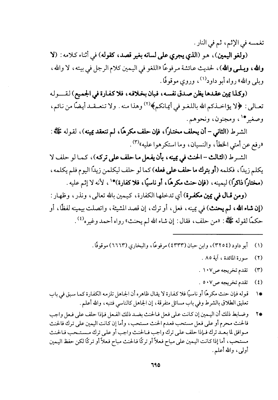 تغمسه في الإثم، ثم في النار، (ولغو اليمين) هو (الذي يجري على لسانه بغير قصد، كقوله) في أثناء كلامه: (لا والله، وبلى والله) ؛ لحديث عائشة مرفوعا «اللغو في اليمين كلام الرجل في بيته لا والله وبلى والله» رواه أبو داود، وروي موقوفا، (وكذا يمين عقدها يظن