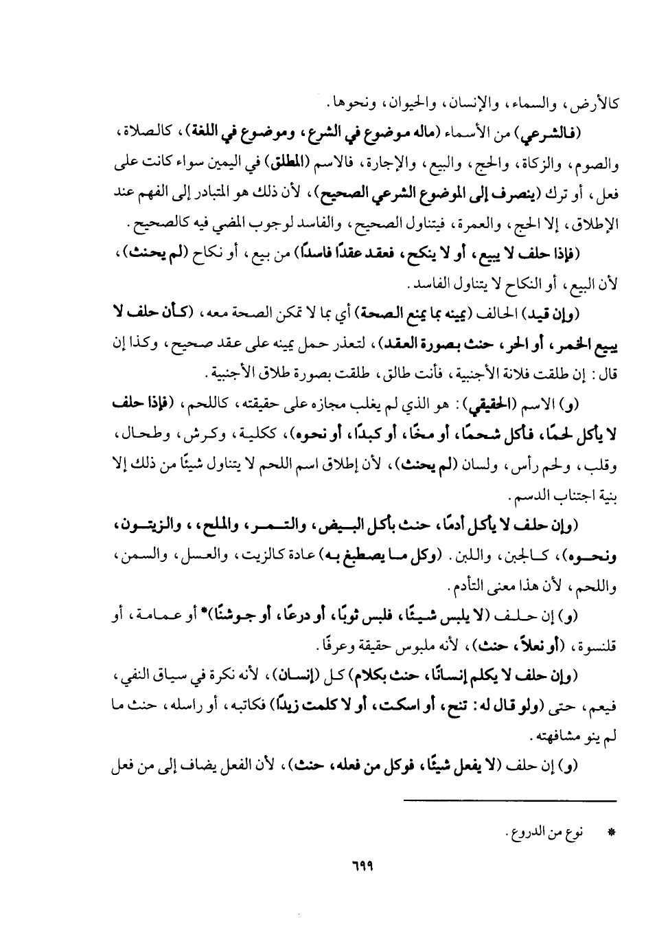 (فالشرعي) من الأسماء (ماله موضوع في الشرع وموضوع في اللغة) ، كالصلاة والصوم والزكاة والحج والبيع والإجارة، فالاسم (المطلق) في اليمين سواء كانت على فعل أو ترك (ينصرف إلى الموضوع الشرعي الصحيح) ، لأن ذلك هو المتبادر إلى الفهم عند الإطلاق، إلا الحج والعمرة فيتناول الصحيح والفاسد لوجوب المضي فيه كالصحيح، (فإذا حلف لا يبيع، أو لا ينكح فعقد عقدا فاسدا) من بيع أو نكاح (لم يحنث) ، لأن البيع أو النكاح لا يتناول الفاسد، (وإن قيد) الحالف (يمينه بما يمنع الصحة) أي بما لا تمكن الصحة معه، (كأن حلف لا يبيع الخمر أو الخنزير حنث بصورة العقد) ؛ لتعذر حمل يمينه على عقد صحيح، وكذا إن قال: إن طلقت فلانة الأجنبية فأنت طالق طلقت بصورة طلاق الأجنبية.