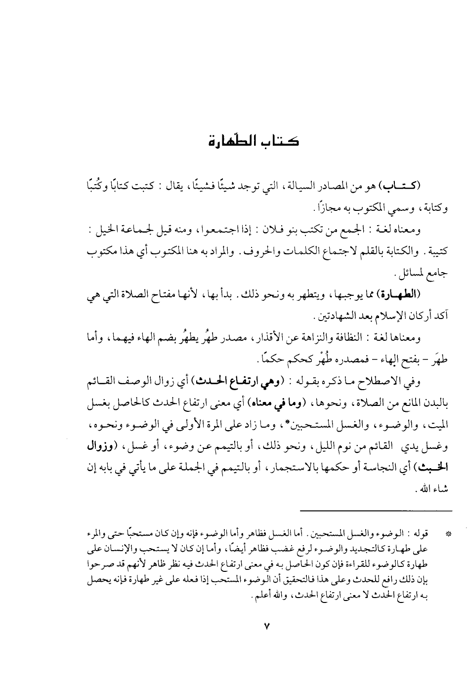 (كتاب) هو من المصادر السيالة أي التي توجد شيئا فشيئا، يقال: كتب كتابا وكتبا وكتابة، وسمي المكتوب به مجازا، ومعناه لغة: الجمع من تكتب بنو فلان: إذا اجتمعوا، ومنه قيل لجماعة الخيل: كتيبة. والكتابة بالقلم لاجتماع الكلمات والحروف. والمراد به هنا المكتوب أي هذا مكتوب جامع لمسائل (الطهارة) مما يوجبها ويتطهر به ونحو ذلك.