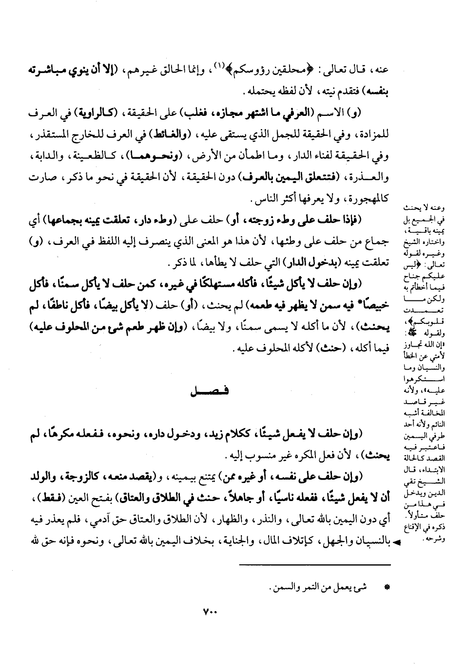 (و) الاسم (العرفي ما اشتهر مجازه فغلب) على الحقيقة، (كالرواية) في العرف للمزادة وفي الحقيقة للجمل الذي يستقي عليه، (والغائط) في العرف للخارج المستقذر، وفي الحقيقة لفناء الدار وما اطمأن من الأرض (ونحوهما) ، كالظعينة والدابة والعذرة، (فتعلق اليمين بالعرف) دون الحقيقة، لأن الحقيقة في نحو ما ذكر صارت كالمهجورة ولا يعرفها أكثر الناس. (فإذا حلف على وطء زوجته، أو) حلف على (وطء دار تعلقت يمينه بجماعها) أي جماع من حلف على وطئها، لأن هذا هو المعنى الذي ينصرف إليه اللفظ في العرف، (و) تعلقت يمينه (بدخول الدار) التي حلف لا يطأها لما ذكر. (وإن حلف لا يأكل شيئا فأكله مستهلكا في غيره، كمن حلف (لا يأكل سمنا فأكل خبيصا فيه سمن لا يظهر فيه طعمه) لم يحنث، (أو) حلف (لا يأكل بيضا فأكل ناطفا لم يحنث) ، لأن ما أكله لا يسمى سمنا ولا بيضا، (وإن ظهر طعم شيء من المحلوف عليه) فيما أكله (حنث) لأكله المحلوف عليه.