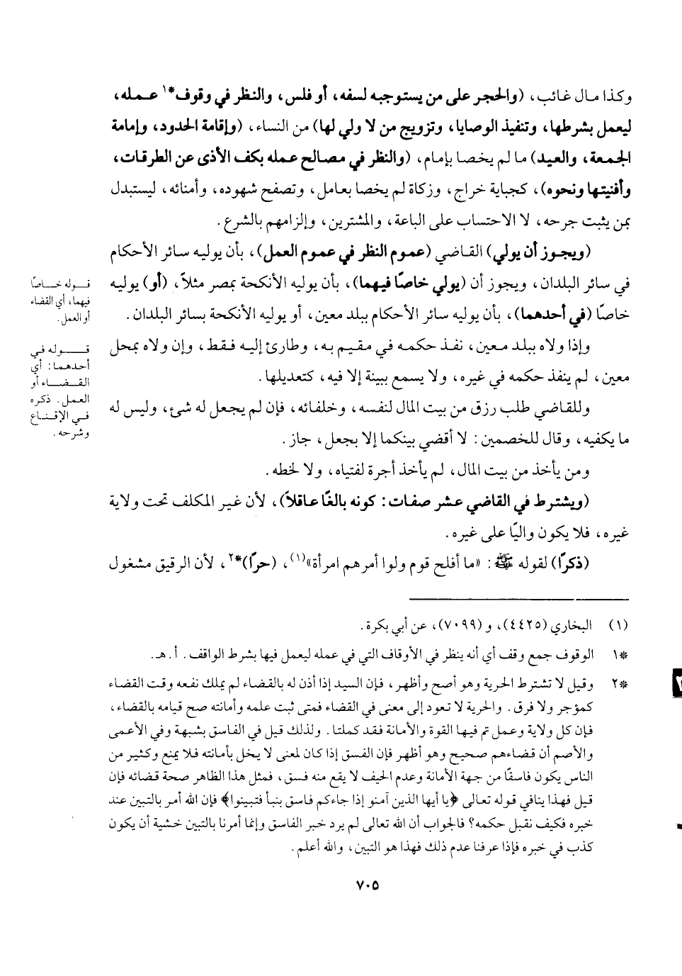 وكذا مال غائب (والحجر على من يستوجبه لسفه أو فلس، والنظر في وقوف عمله ليعمل بشروطها، وتنفيذ الوصايا، وتزويج من لا ولي لها) من النساء، (وإقامة الحدود، وإمامة الجمعة والعيد) ما لم يختصا بإمام، (والنظر في مصالح عمله بكف الأذى عن الطرقات وأفنيتها ونحوه) ، كجباية خراج وزكاة لم يخصا بعامل، وتصفح شهوده وأمنائه ليستبدل بمن يثبت جرحه، لا الاحتساب على الباعة والمشترين، وإلزامهم بالشرع.