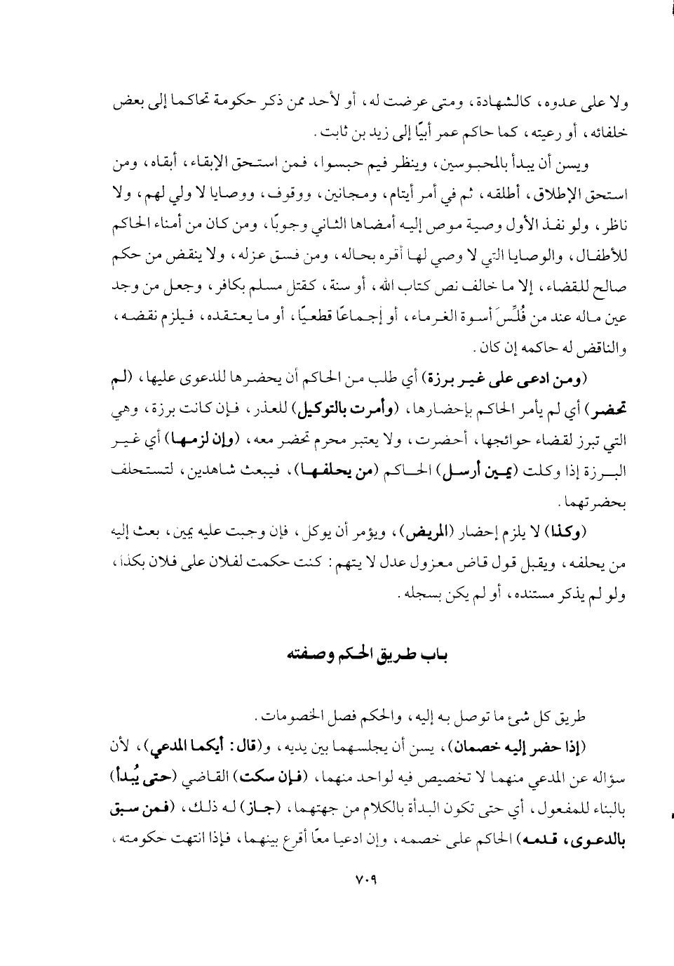 ولا على عدوه، كالشهادة ومتى عرضت له أو لأحد ممن ذكر حكومة تحاكما إلى بعض خلفائه أو رعيته، كما حاكم عمر أبيا إلى زيد بن ثابت. ويسن أن يبدأ بالمحبوسين وينظر فيم حبسوا، فمن استحق الإبقاء أبقاه، ومن استحق الإطلاق أطلقه، ثم في أمر أيتام ومجانين ووقوف ووصايا لا ولي لهم، ولا ناظر، ولو نفذ الأول وصية موصى إليه أمضاها الثاني وجوبا، ومن كان من أمناء الحاكم للأطفال والوصايا التي لا وصي لها بحاله أقره، ومن فسق عزله، ولا ينقض من حكم صالح للقضاء، إلا ما خالف نص كتاب الله أو سنة، كقتل مسلم بكافر، وجعل من وجد عين ماله عند من فلس أسوة الغرماء أو إجماعا قطعيا، أو ما يعتقده، فيلزم نقضه والناقض له حاكمه إن كان.