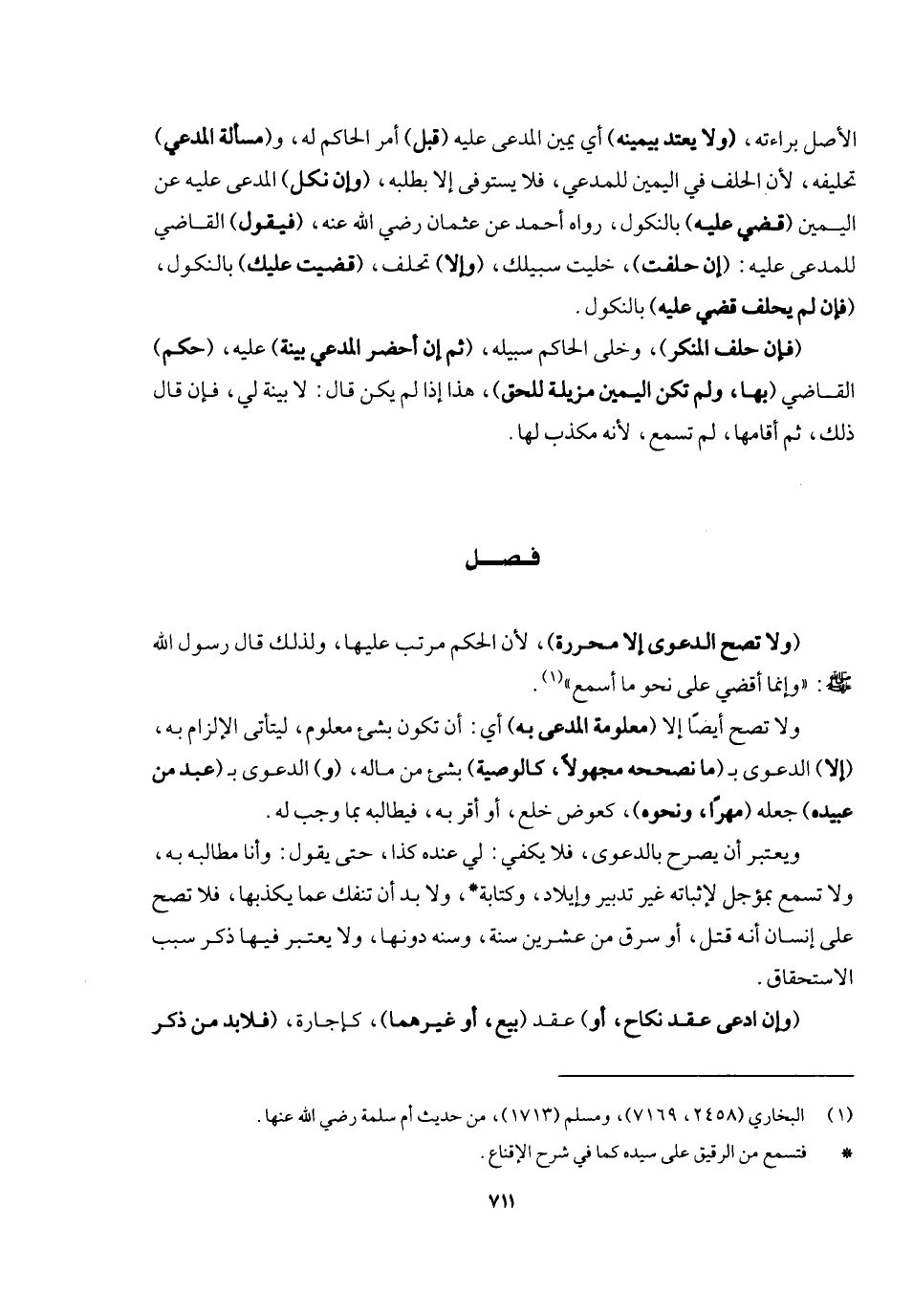 فصل (ولا تصح الدعوى إلا محررة) لأن الحكم مرتب عليها، ولذلك قال رسول الله - صَلَّى اللَّهُ عَلَيْهِ وَسَلَّمَ -: «وإنما أقضي على نحو ما أسمع» ولا تصح أيضا إلا (معلومة المدعى به) أي: تكون بشيء معلوم ليأتي الإلزام، (إلا) الدعوى (بما نصححه مجهولا، كالوصية) بشيء من ماله، (و) الدعوى بـ (عبد من عبيده) جعله (مهرا ونحوه) ، كعوض خلع، أو أقر به فيطالبه بما وجب له، ويعتبر أن يصرح بالدعوى، فلا يكفي: لي عنده كذا حتى يقول: وأنا مطالب به، ولا تسمع بمؤجل لإثباته غير تدبير واستيلاد وكتابة، ولا بد أن تنفك عما يكذبها، فلا تصح على إنسان أنه قتل أو سرق من عشرين سنة وسنة دونها، ولا يعتبر فيها ذكر سبب الاستحقاق.
