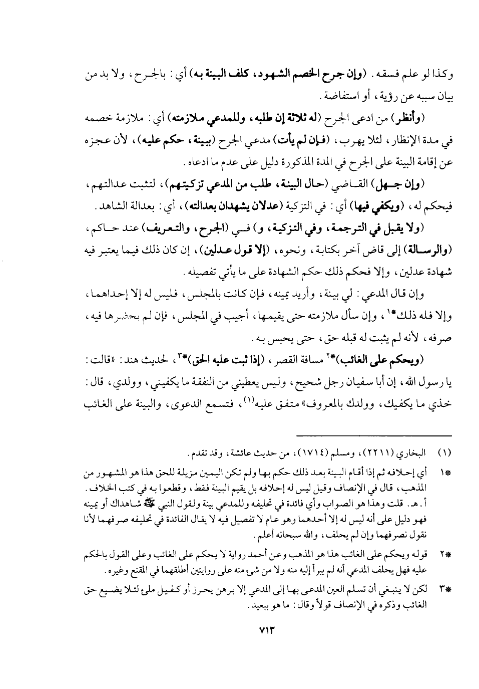 (وانظر) من ادعى الجرح (له ثلاثة إن طلبه، وللمدعي ملازمته) أي ملازمة خصمه في مدة الانتظار لئلا يهرب، (فإن لم يأت) مدعي الجرح (ببينة حكم عليه) ، لأن عجزه عن إقامة البينة على الجرح في المدة المذكورة دليل على عدم ما ادعاه. (وإن جهل) القاضي (حال البينة طلب من المدعي تزكيتهم) لتثبت عدالتهم، فيحكم له، (ويكفي فيها) أي في التزكية (عدلان يشهدان بعدالة الشاهد. (ولا يقبل في الترجمة وفي التزكية و) في (الجرح والتعريف) عند حاكم (والرسالة) إلى قاض آخر بكتابة ونحوه، (إلا قول عدلين) إن كان ذلك فيما يعتبر فيه شهادة عدلين، وإلا فحكم ذلك حكم الشهادة على ما يأتي تفصيله. وإن قال المدعي: لي بينة وأريد يمينه، فإن كانت بالمجلس فليس له إلا إحداهما، وإلا فله ذلك، وإن سأل ملازمته حتى يقيمها أجيب في المجلس، فإن لم يحضرها فيه صرفه لأنه لم يثبت له قبله حق حتى يحبس به.