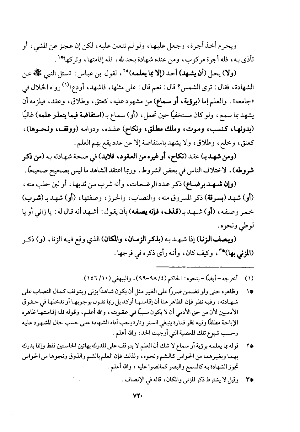 ويحرم أخذ أجرة وجعل عليها ولو لم تتعين عليه، لكن إن عجز عن المشي، أو تأذى به فله أجرة مركوب، ومن عنده شهادة بحد لله فله إقامتها وتركها. (ولا) يحل (أن يشهد) أحد (إلا بما يعلمه) ؛ لقول ابن عباس: «سئل النبي - صَلَّى اللَّهُ عَلَيْهِ وَسَلَّمَ - عن الشهادة، فقال: ترى الشمس؟ [قال: نعم] قال: على مثلها فاشهد أو دع» رواه الخلال في " جامعه ". والعلم إما (برؤية أو سماع) من مشهود عليه، كعتق وطلاق وعقد، فيلزمه أن يشهد بما سمع ولو كان مستخفيا حين تحمل، (أو) سماع بـ (استفاضة فيما يتعذر علمه) غالبا (بدونها، كنسب وموت وملك مطلق ونكاح) عقده ودوامه (ووقف، ونحوها) ، كعتق وخلع وطلاق ولا يشهد باستفاضة إلا عن عدد يقع بهم العلم