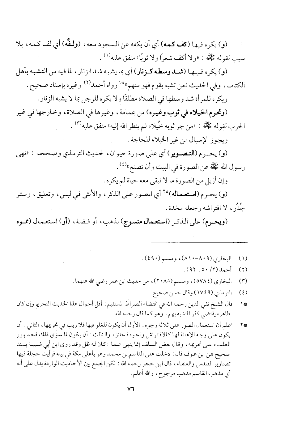 (وتحرم الخيلاء في ثوب وغيره) من عمامة وغيرها في الصلاة وخارجها في غير الحرب؛ لقوله - صَلَّى اللَّهُ عَلَيْهِ وَسَلَّمَ -: «من جر ثوبه خيلاء لم ينظر الله إليه» متفق عليه، ويجوز الإسبال من غير الخيلاء للحاجة. (و) يحرم (التصوير) أي على صورة حيوان؛ لحديث الترمذي وصححه «نهى رسول الله - صَلَّى اللَّهُ عَلَيْهِ وَسَلَّمَ - عن الصورة في البيت وأن تصنع» " وإن أزيل من الصورة ما لا تبقى معه حياة لم يكره، (و) يحرم (استعماله) أي المصور على الذكر والأنثى في لبس وتعليق وستر جدر لا افتراشه وجعله مخدة. (ويحرم) على الذكر (استعمال منسوج) بذهب أو فضة (أو) استعمال (مموه