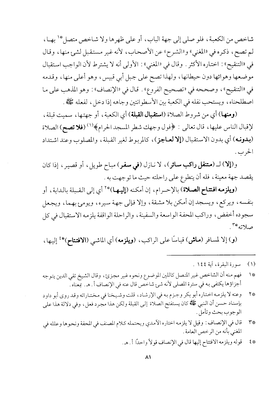 (ومنها) أي من شروط الصلاة (استقبال القبلة) أي الكعبة أو جهتها لمن بعد، سميت قبلة لإقبال الناس عليها قال تعالى: {فَوَلِّ وَجْهَكَ شَطْرَ الْمَسْجِدِ الْحَرَامِ} [البقرة: ١٤٤] (فلا تصح) الصلاة (بدونه) أي بدون استقبال (إلا لعاجز) كالمربوط لغير القبلة والمصلوب وعند اشتداد الحرب، وإلا لـ (متنقل راكب سائر) لا نازل (في سفر) مباح طويل أو قصير إذا كان يقصد جهة معينة فله أن يتطوع على راحلته حيث ما توجهت به، (ويلزمه افتتاح الصلاة) بالإحرام إن أمكنه (إليها) أي إلى القبلة بالدابة أو بنفسه ويركع ويسجد إن أمكنه بلا مشقة وإلا فإلى جهة سيره ويومئ بهما، ويجعل سجوده أخفض، وراكب المحفة الواسعة والسفينة والراحلة الواقفة يلزمه الاستقبال في كل صلاته (و) إلا لمسافر (ماش) قياسا على الراكب، (ويلزمه) أي الماشي (الافتتاح) إليها