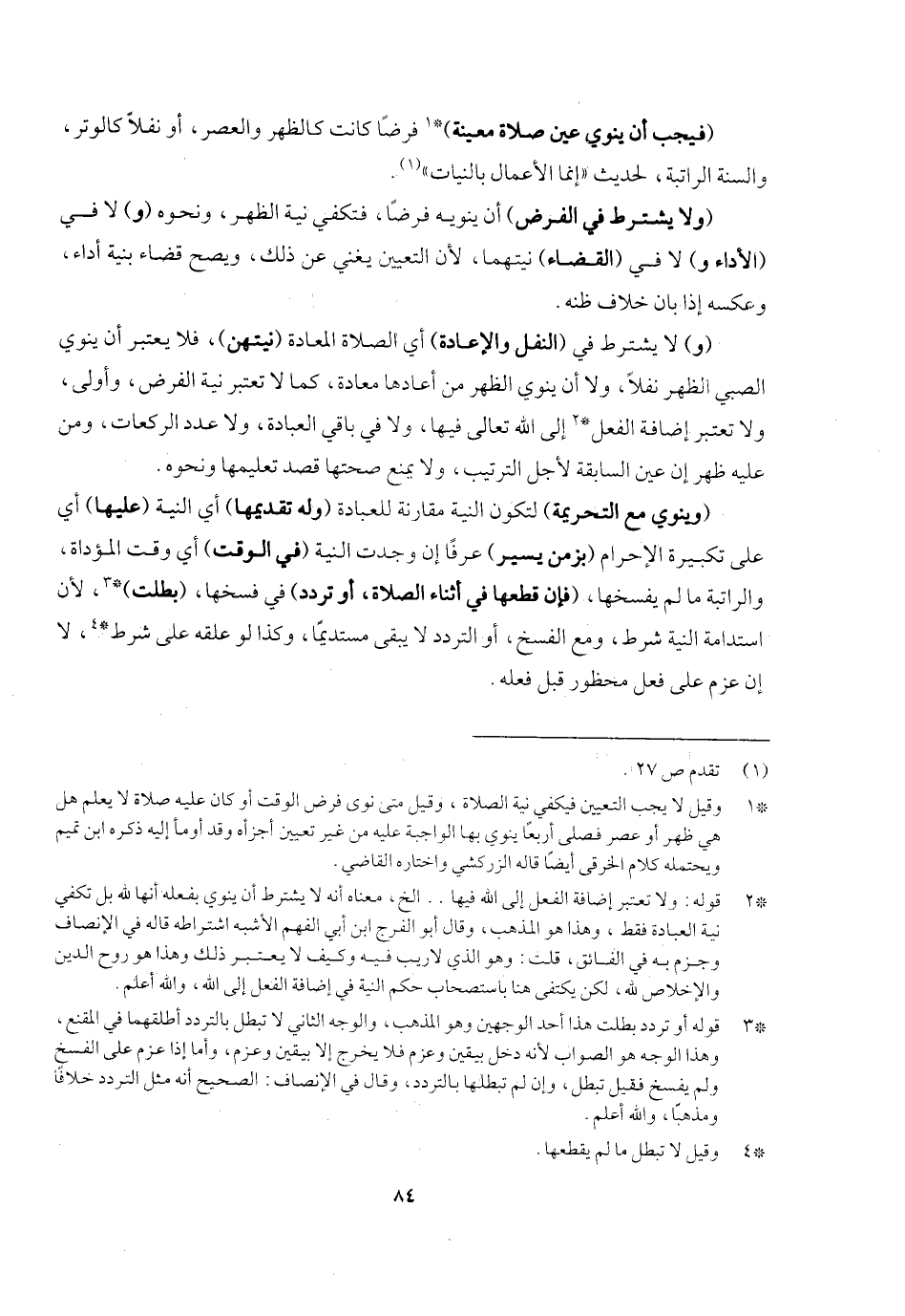 (فيجب أن ينوي عين صلاة معينة) فرضا كانت كالظهر والعصر أو نفلا كالوتر والسنة الراتبة لحديث: «إنما الأعمال بالنيات» (ولا يشترط في الفرض) أن ينويه فرضا فتكفي نية الظهر ونحوه (و) لا في (الأداء و) لا في (القضاء) نيتهما لأن التعيين يغني عن ذلك، ويصح قضاء بنية أداء وعكسه إذا بان خلاف ظنه (و) لا يشترط في (النفل والإعادة) أي الصلاة المعادة (نيتهن) فلا يعتبر أن ينوي الصبي الظهر نفلا، ولا أن ينوي الظهر من أعادها معادة كما لا تعتبر نية الفرض وأولى، ولا تعتبر إضافة الفعل إلى الله تعالى فيها، ولا في باقي العبادات، ولا عدد الركعات، ومن عليه ظهر إن عين السابقة لأجل الترتيب، ولا يمنع صحتها قصد تعليمها ونحوه.