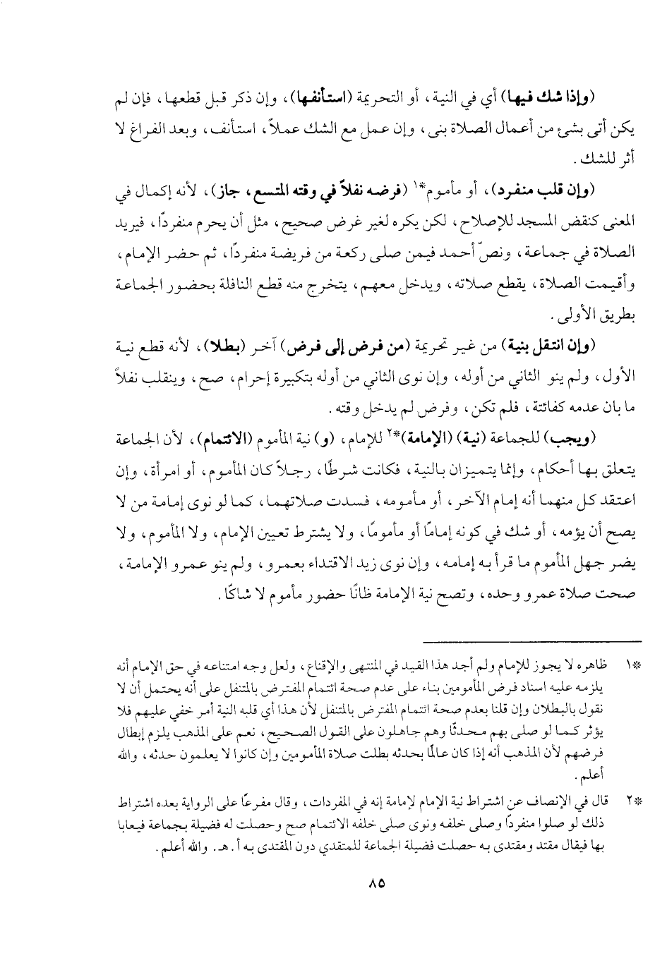 ونص أحمد فيمن صلى ركعة من فريضة منفردا، ثم حضر الإمام وأقيمت الصلاة يقطع صلاته ويدخل معهم فيخرج منه قطع النافلة بحضور الجماعة بطريق الأولى (وإن انتقل بنية) من غير تحريمة (من فرض إلى فرض) آخر (بطلا) لأنه قطع نية الأول ولم ينو الثاني من أوله، وإن نوى الثاني من أوله بتكبيرة إحرام صح وينقلب نفلا ما بان عدم كفايته فلم تكن وفرض لم يدخل وقته.