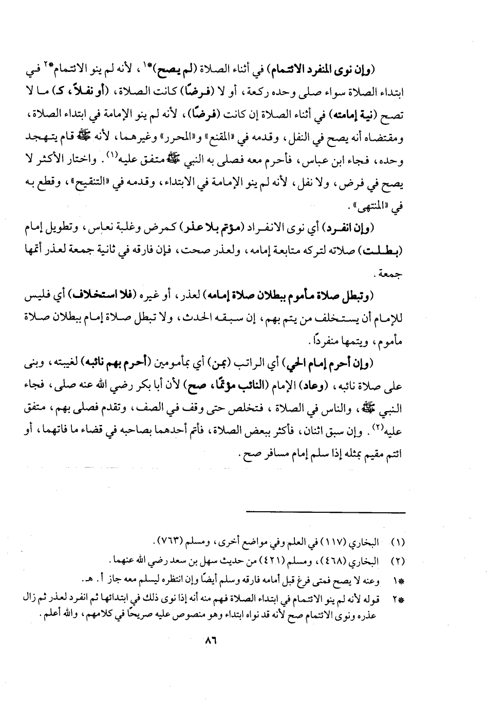(وإن نوى المنفرد الائتمام) في أثناء الصلاة (لم تصح) لأنه لم ينو الائتمام في ابتداء الصلاة سواء صلى وحده ركعة أولا (فرضا) كانت الصلاة، أو نفلا (كـ) ما لا تصح (نية إمامته) في أثناء الصلاة إن كانت (فرضا) لأنه لم ينو الإمامة في ابتداء الصلاة ومقتضاه أنه يصح في النفل، وقدمه في " المقنع " و" المحرر " وغيرهما «لأنه - صَلَّى اللَّهُ عَلَيْهِ وَسَلَّمَ - قام يتهجد وحده فجاء ابن عباس فأحرم معه فصلى به النبي - صَلَّى اللَّهُ عَلَيْهِ وَسَلَّمَ -» متفق عليه. واختار الأكثر لا يصح في فرض، ولا نفل؛ لأنه لم ينو الإمامة في الابتداء، وقدمه في " التنقيح "، وقطع به في " المنتهى ".