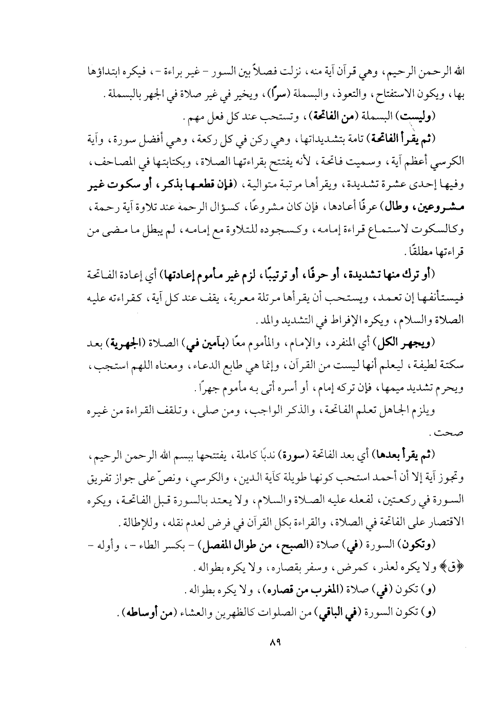 اللَّهِ الرَّحْمَنِ الرَّحِيمِ وهي قرآن آية منه نزلت فصلا بين السور غير براءة فيكره ابتداؤها بها، ويكون الاستفتاح والتعوذ والبسملة (سرا) ويخير في غير صلاة في الجهر بالبسملة (وليست) البسملة (من الفاتحة) وتستحب عند كل فعل مهم.