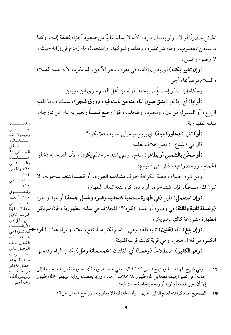 (وإن بلغ) الماء (قلتين) تثنية قلة، وهي اسم لكل ما ارتفع وعلا، والمراد هنا: الجرة الكبيرة من قلال هجر، وهي قرية كانت قرب المدينة. (وهو الكثير) اصطلاحا (وهما) أي القلتان (خمسمائة رطل) بكسر الراء وفتحها