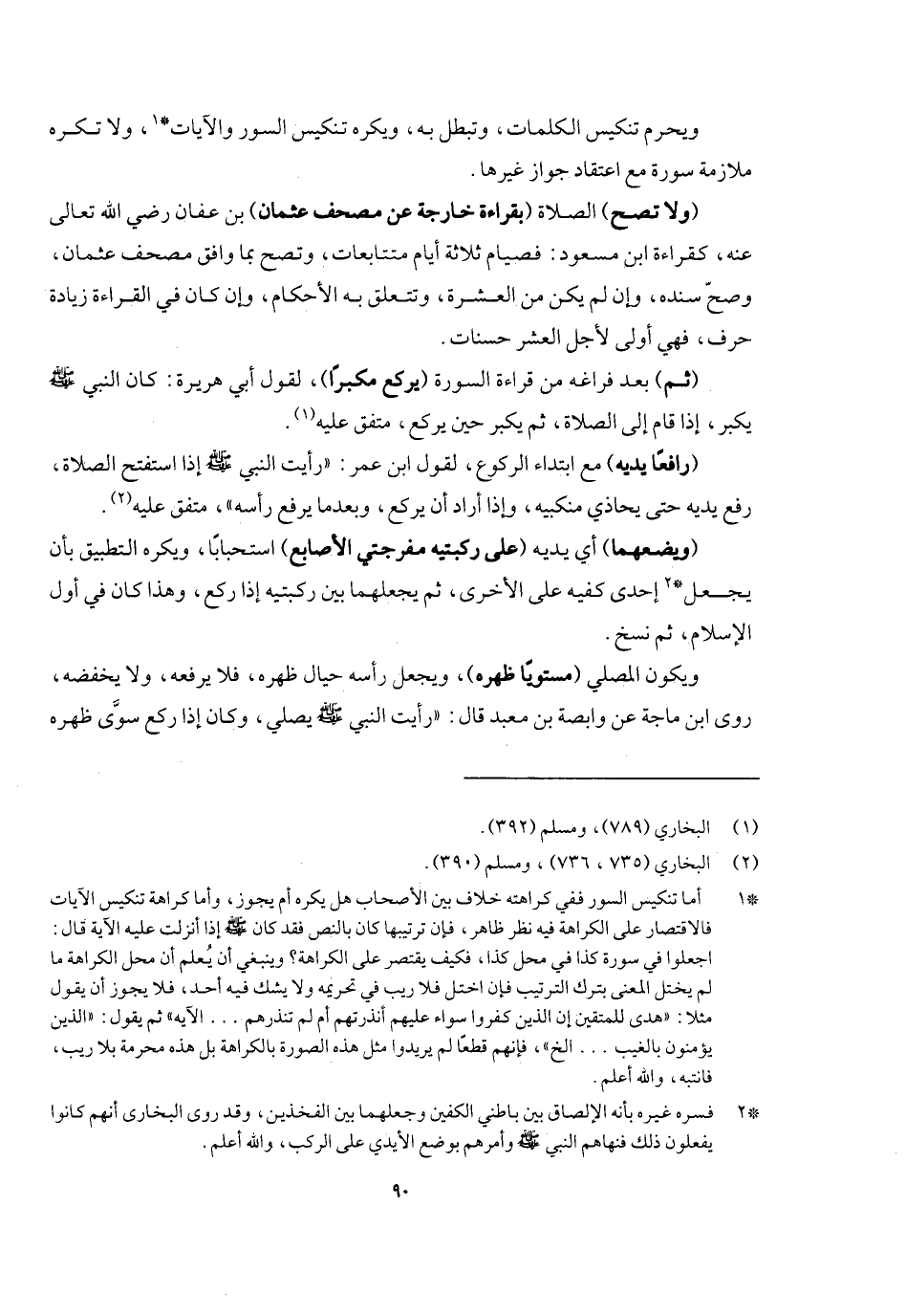 (ولا تصح) الصلاة (بقراءة خارجة عن مصحف عثمان) بن عفان - رَضِيَ اللَّهُ تَعَالَى عَنْهُ - كقراءة ابن مسعود: فصيام ثلاثة أيام متتابعات، وتصح بما وافق مصحف عثمان وصح سنده، وإن لم يكن من العشرة وتتعلق به الأحكام، وإن كان في القراءة زيادة حرف فهي أولى لأجل العشر حسنات.