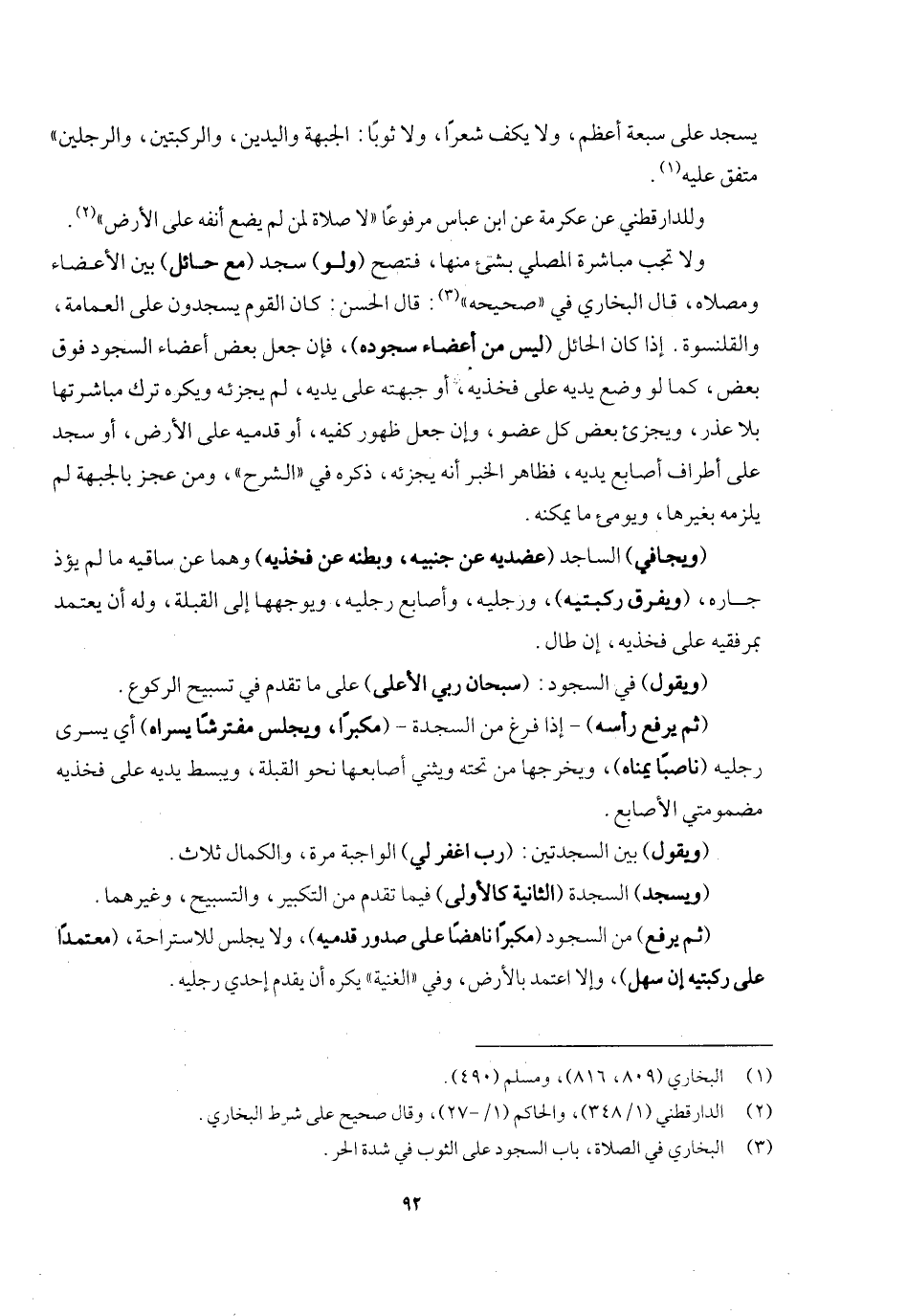 يسجد على سبعة أعظم، ولا يكف شعرا، ولا ثوبا: الجبهة واليدين والركبتين والرجلين» متفق عليه. وللدارقطني عن عكرمة عن ابن عباس مرفوعا «لا صلاة لمن لم يضع أنفه على الأرض» ، ولا تجب مباشرة المصلي بشيء منها، فتصح (ولو) سجد (مع حائل) بين الأعضاء ومصلاه قال البخاري في " صحيحه ": قال الحسن: كان القوم يسجدون على