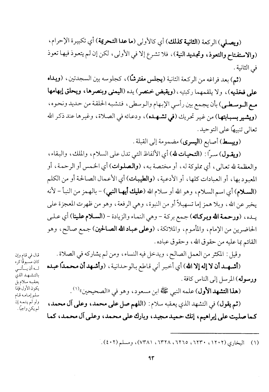 (ثم) بعد فراغه من الركعة الثانية (يجلس مفترشا) كجلوسه بين السجدتين (ويداه على فخذيه) ، ولا يلقمهما ركبتيه (ويقبض خنصر) يده (اليمنى وبنصرها ويحلق إبهامها مع الوسطى) بأن يجمع بين رأس الإبهام والوسطى فتشبه الحلقة من حديد ونحوه، (ويشير بسبابتها) من غير تحريك (في تشهده) ودعائه في الصلاة وغيرها عند ذكر الله تعالى تنبيها على التوحيد، (ويبسط) أصابع (اليسرى) مضمومة إلى القبلة، (ويقول) سرا: (التحيات لله) أي الألفاظ التي تدل على السلام والملك والبقاء والعظمة لله تعالى أي مملوكة له أو مختصة به، (والصلوات) أي الخمس، أو الرحمة، أو المعبود بها، أو العبادات كلها، أو الأدعية، (والطيبات) أي الأعمال الصالحة، أو من الكلم (السلام) أي اسم السلام وهو الله، أو