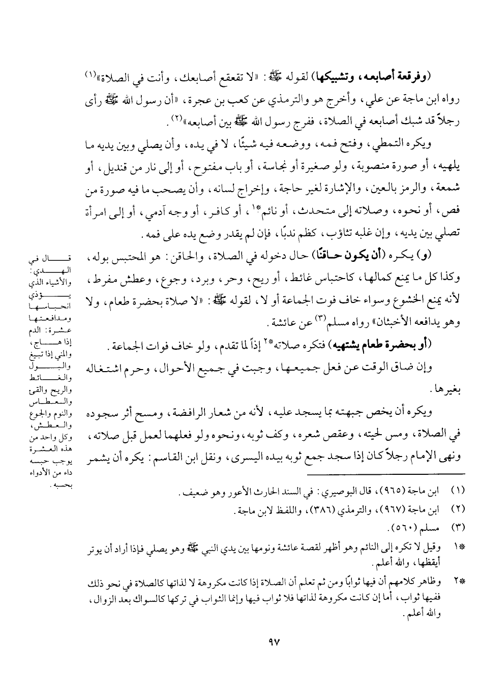 (و) يكره (أن يكون حاقنا) حال دخوله في الصلاة، والحاقن: هو المحتبس بوله، وكذا كل ما يمنع كمالها كاحتباس غائط، أو ريح وحر وبرد وجوع وعطش مفرط؛ لأنه يمنع الخشوع وسواء خاف فوت الجماعة أو لا؛ لقوله - صَلَّى اللَّهُ عَلَيْهِ وَسَلَّمَ -: «لا صلاة بحضرة طعام، ولا وهو يدافعه الأخبثان» ، رواه مسلم عن عائشة، (أو بحضرة طعام يشتهيه) فتكره صلاته إذا لما تقدم، ولو خاف فوت الجماعة، وإن ضاق الوقت عن فعل جميعها وجبت في جميع الأحوال وحرم اشتغاله بغيرها.