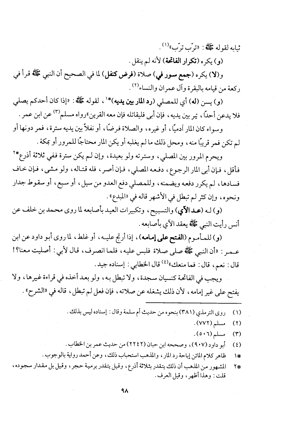 (و) يسن (له) أي للمصلي (رد المار بين يديه) ؛ لقوله - صَلَّى اللَّهُ عَلَيْهِ وَسَلَّمَ -: «إذا كان أحدكم يصلي فلا يدعن أحدا يمر بين يديه، فإن أبى فليقاتله فإن معه القرين» ، رواه مسلم عن ابن عمر، وسواء كان المار آدميا، أو غيره والصلاة فرضا أو نفلا، بين يديه ستره فمر دونها، أو لم تكن فمر قريبا منه، ومحل ذلك ما لم يغلبه، أو يكن المار محتاجا إلى المرور، أو بمكة، ويحرم المرور بين المصلي وسترته ولو بعيدة، وإن لم يكن سترة ففي ثلاثة أذرع فأقل، فإن أبى المار الرجوع دفعه المصلي، فإن أصر فله قتاله ولو مشى، فإن خاف فسادها لم يكرر دفعه ويضمنه، وللمصلي دفع العدو من سيل وسبع، أو سقوط جدار ونحوه، وإن كثر لم تبطل في الأشهر قاله في " المبدع " (و) له (عد الآي) والتسبيح وتكبيرات العيد بأصابعه لما روى محمد بن خلف عن أنس «رأيت النبي - صَلَّى اللَّهُ عَلَيْهِ وَسَلَّمَ - يعقد الآي بأصابعه»
