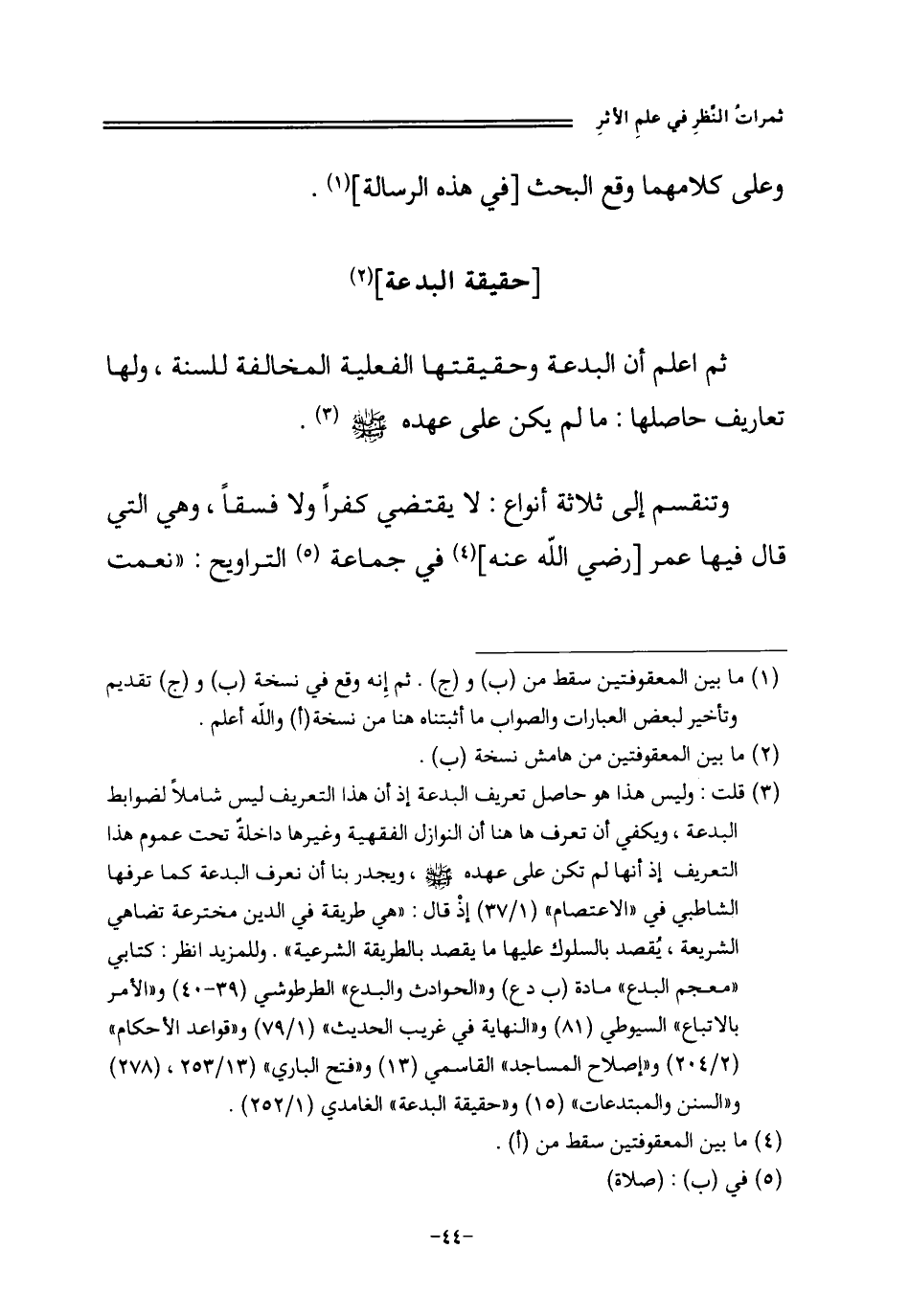 ثمَّ اعْلَم أَن الْبِدْعَة وحقيقتها الفعلية الْمُخَالفَة للسّنة وَلها تعاريف حاصلها مَا لم يكن على عَهده صلى الله عَلَيْهِ وَسلم