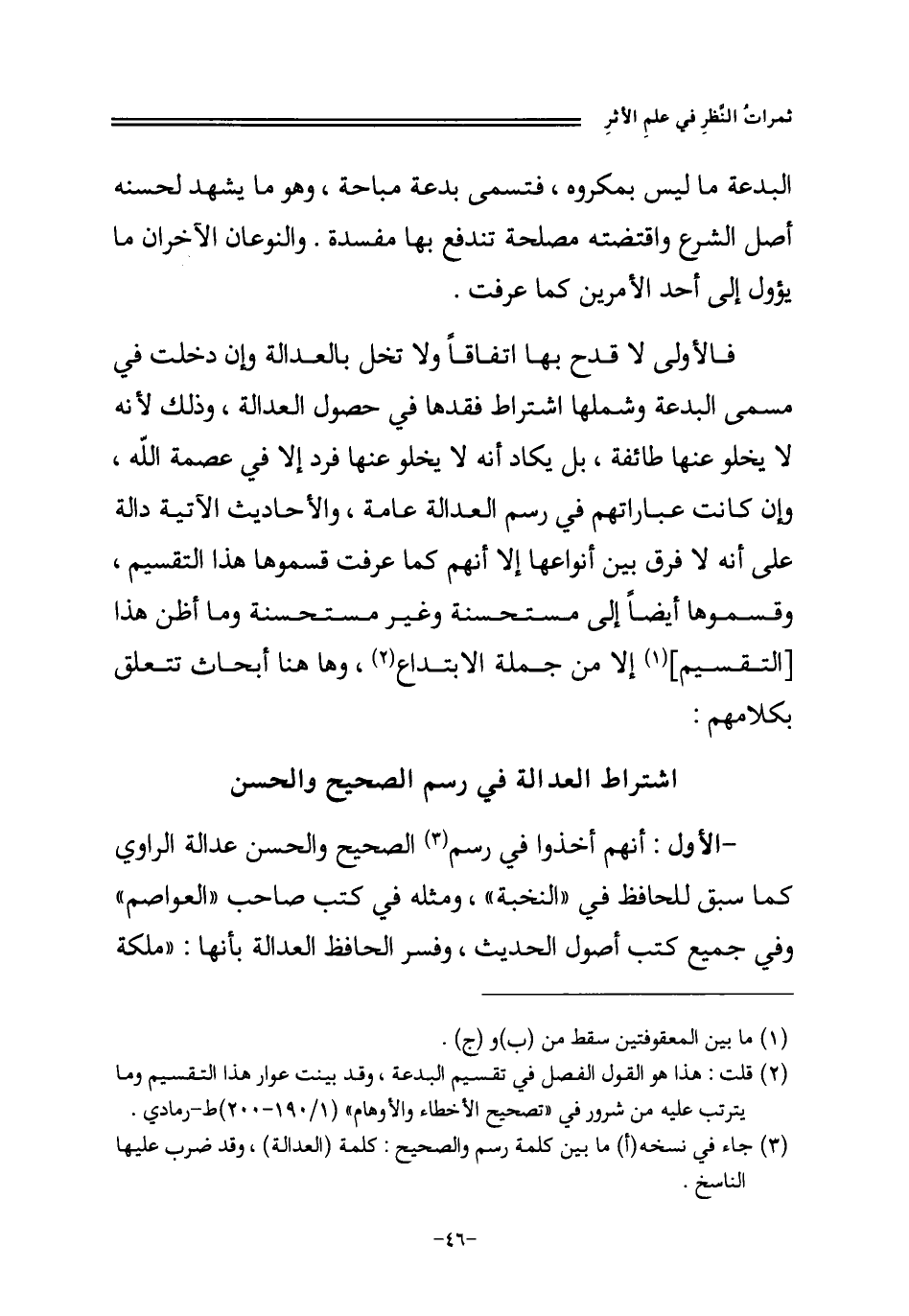 الأول أَنهم أخذُوا فِي رسم الصَّحِيح وَالْحسن عَدَالَة الرَّاوِي كَمَا سبق لِلْحَافِظِ فِي النخبة وَمثله فِي كتب صَاحب العواصم وَفِي جَمِيع كتب أصُول الحَدِيث وَفسّر الْحَافِظ الْعَدَالَة بِأَنَّهَا ملكة