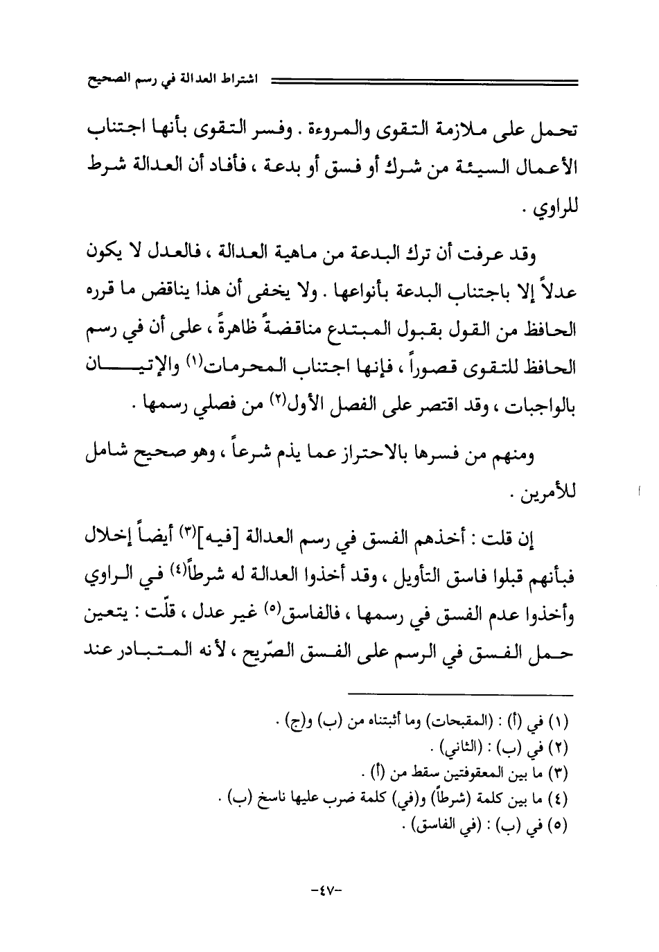وَقد عرفت أَن ترك الْبِدْعَة من مَاهِيَّة الْعَدَالَة فالعدل لَا يكون عدلا إِلَّا باجتناب الْبِدْعَة بأنواعها