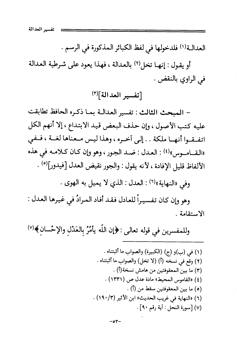 المبحث الثَّالِث تَفْسِير الْعَدَالَة بِمَا ذكره الْحَافِظ تطابقت عَلَيْهِ كتب الْأُصُول وَإِن حذف الْبَعْض قيد الابتداع إِلَّا أَنهم الْكل اتَّفقُوا أَنَّهَا ملكة إِلَى آخِره وَهَذَا لَيْسَ مَعْنَاهَا لُغَة فَفِي الْقَامُوس الْعدْل ضد الْجور وَهُوَ إِن كَانَ كَلَامه فِي هَذِه الْأَلْفَاظ قَلِيل الإفادة لِأَنَّهُ يَقُول والجور نقيض الْعدْل فيدور