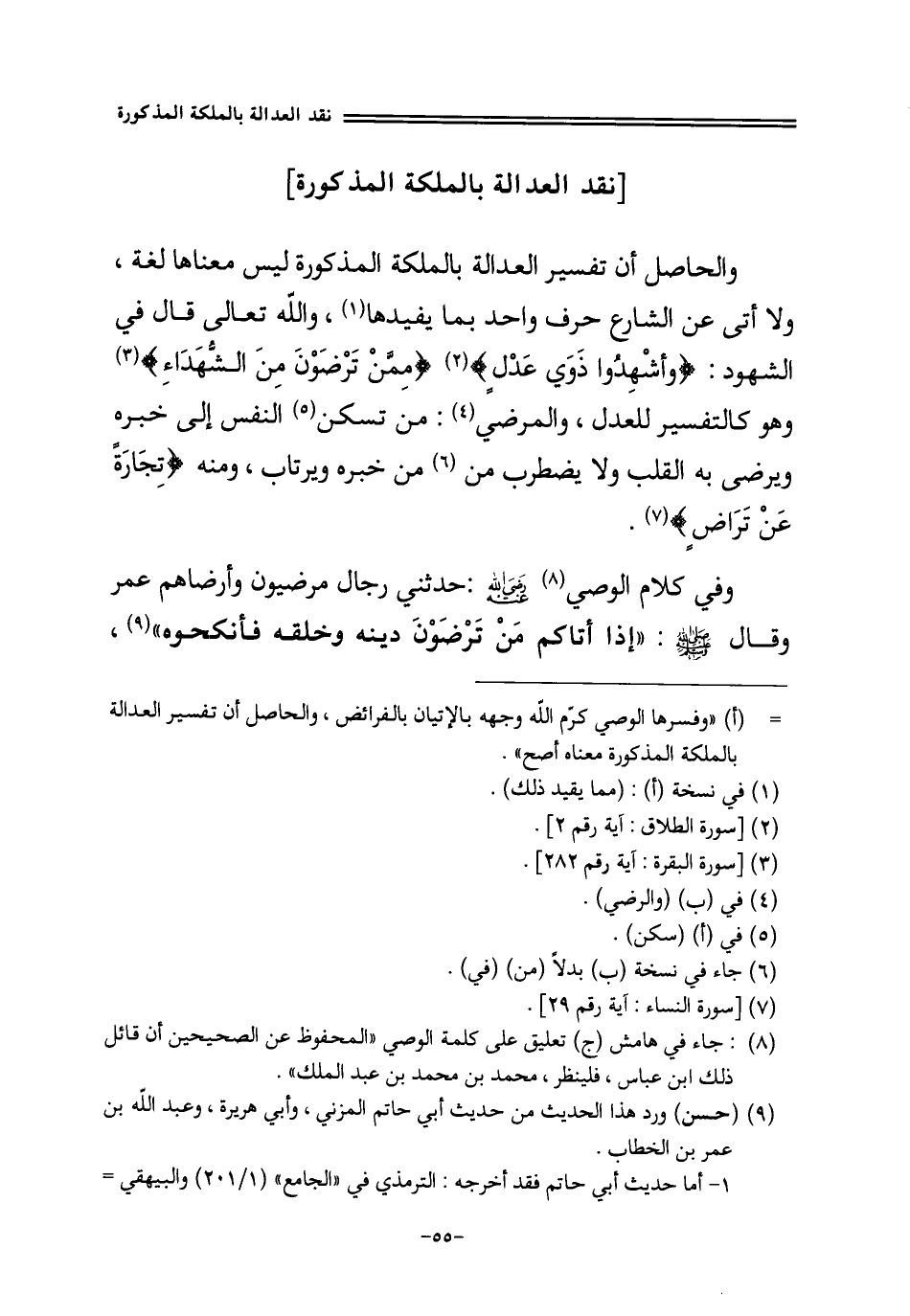 وَالْحَاصِل أَن تَفْسِير الْعَدَالَة بالملكة الْمَذْكُورَة لَيْسَ مَعْنَاهَا لُغَة وَلَا أَتَى عَن الشَّارِع حرف وَاحِد بِمَا يفيدها وَالله تَعَالَى قَالَ فِي الشُّهُود {وَأشْهدُوا ذَوي عدل} {مِمَّن ترْضونَ من الشُّهَدَاء} وَهُوَ كالتفسير للعدل والمرضي من تسكن النَّفس إِلَى خَبره ويرضى بِهِ الْقلب وَلَا يضطرب من من خَبره ويرتاب وَمِنْه {تِجَارَة عَن ترَاض}