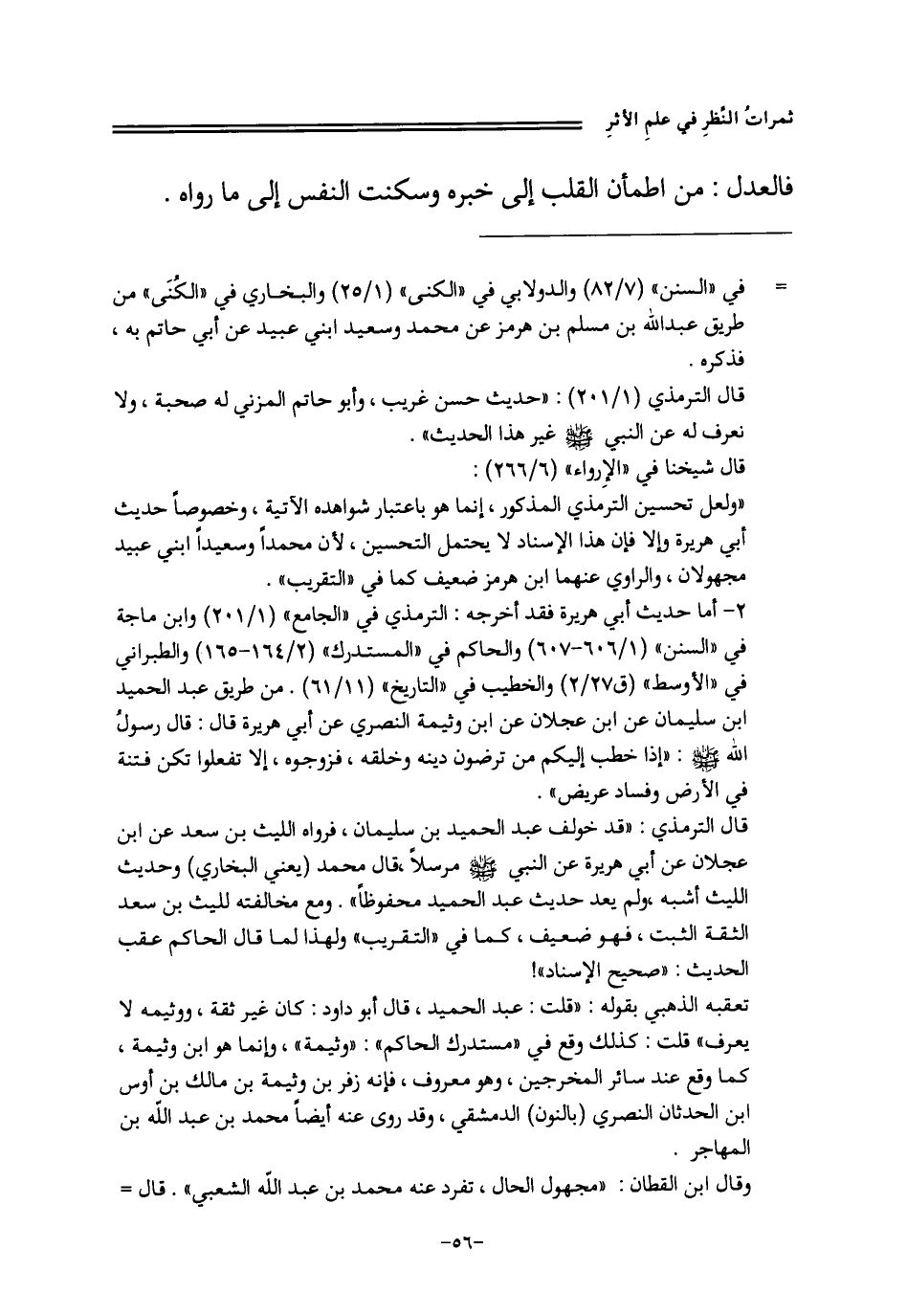 فالعدل من اطْمَأَن الْقلب إِلَى خَبره وسكنت النَّفس إِلَى مَا رَوَاهُ