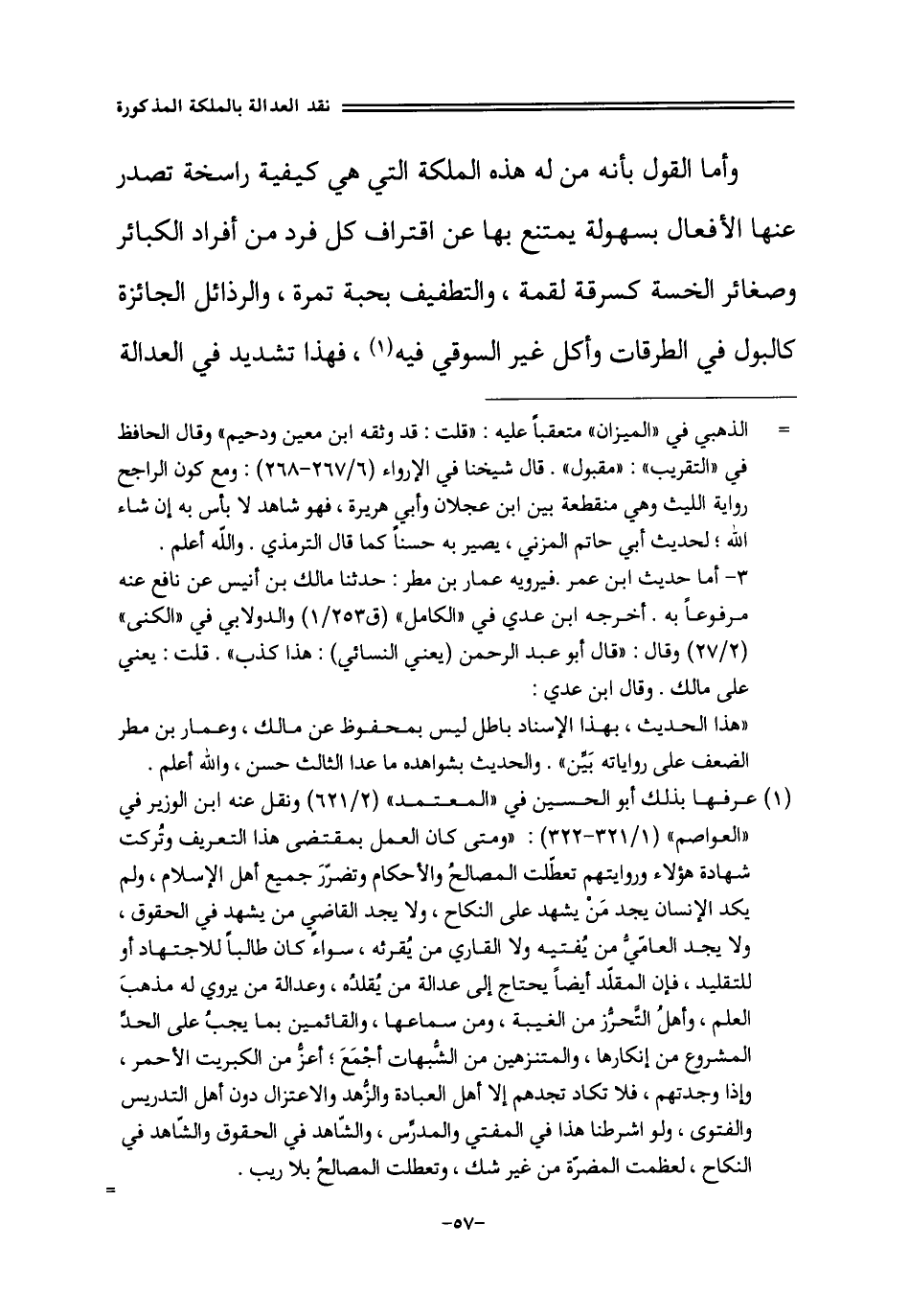 وَأما القَوْل بِأَنَّهُ من لَو هَذِه الملكة الَّتِي هِيَ كَيْفيَّة راسخة تصدر عَنْهَا الْأَفْعَال بسهولة يمْتَنع بهَا عَن اقتراف كل فَرد من أَفْرَاد الْكَبَائِر وصغائر الخسة كسرقة لقْمَة والتطفيف بِحَبَّة تَمْرَة والرذائل الْجَائِزَة كالبول فِي الطرقات وَأكل غير السوقي فِيهِ فَهَذَا تَشْدِيد فِي الْعَدَالَة