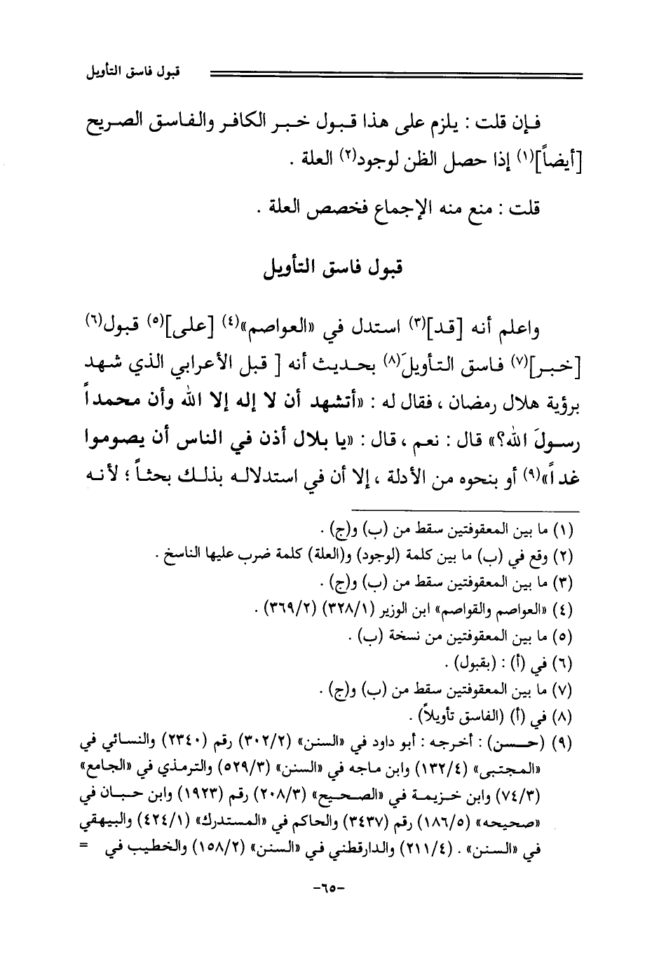 وَاعْلَم أَنه قد اسْتدلَّ فِي العواصم على قبُول خبر فَاسق التَّأْوِيل بِحَدِيث أَنه قبل الْأَعرَابِي الَّذِي شهد بِرُؤْيَة هِلَال رَمَضَان فَقَالَ لَهُ (أَتَشهد أَن لَا إِلَه إِلَّا الله وَأَن مُحَمَّدًا رَسُول الله قَالَ نعم قَالَ يَا بِلَال أذن فِي النَّاس أَن يَصُومُوا غَدا) أَو بِنَحْوِهِ من الْأَدِلَّة إِلَّا أَن فِي استدلاله بذلك بحثا لِأَنَّهُ