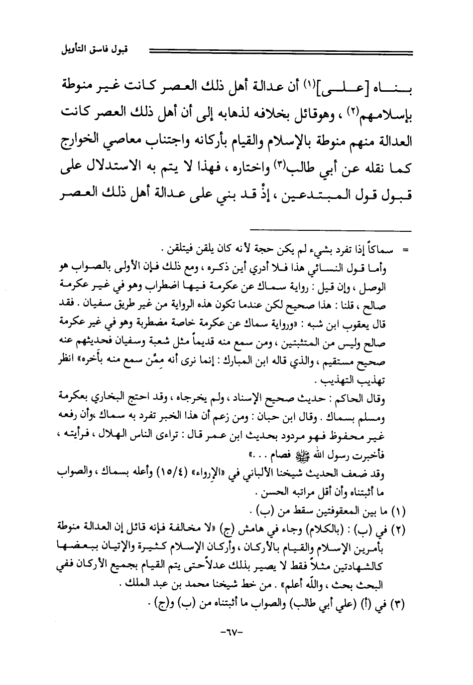 بناه على أَن عَدَالَة أهل ذَلِك الْعَصْر كَانَت غير منوطة بِإِسْلَامِهِمْ وَهُوَ قَائِل بِخِلَافِهِ لذهابه إِلَى أَن أهل ذَلِك الْعَصْر كَانَت الْعَدَالَة مِنْهُم منوطة بِالْإِسْلَامِ وَالْقِيَام بأركانه وَاجْتنَاب معاصي الْخَوَارِج كَمَا نَقله عَن أبي طَالب وَاخْتَارَهُ فَهَذَا لَا يتم بِهِ الِاسْتِدْلَال على قبُول قَول المبتدعين إِذْ قد بني على عَدَالَة أهل ذَلِك الْعَصْر