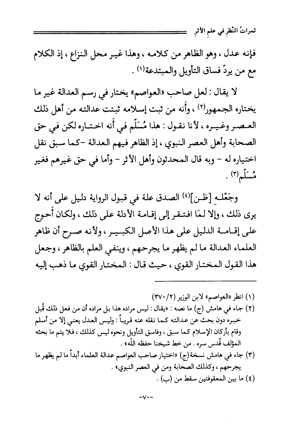 لَا يُقَال لَعَلَّ صَاحب العواصم يخْتَار فِي رسم الْعَدَالَة غير مَا يختاره الْجُمْهُور وَأَنه من ثَبت إِسْلَامه ثبتَتْ عَدَالَته من أهل ذَلِك الْعَصْر وَغَيره لأَنا نقُول هَذَا مُسلم فِي أَنه اخْتَارَهُ لَكِن فِي حق الصَّحَابَة وَأهل الْعَصْر النَّبَوِيّ إِذْ الظَّاهِر فيهم الْعَدَالَة كَمَا سبق نقل اخْتِيَاره لَهُ وَبِه قَالَ المحدثون وَأهل الْأَثر وَأما فِي حق غَيرهم فَغير مُسلم
