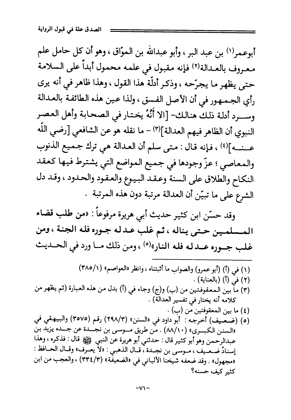 أَبُو عمر بن عبد الْبر وَأَبُو عبد الله بن الْمواق وَهُوَ أَن كل حَامِل علم مَعْرُوف بِالْعَدَالَةِ فَإِنَّهُ مَقْبُول فِي علمه مَحْمُول أبدا على السَّلامَة حَتَّى يظْهر مَا يجرحه وَذكر أَدِلَّة هَذَا القَوْل وَهَذَا ظَاهر فِي أَنه يرى رَأْي الْجُمْهُور فِي أَن الأَصْل الْفسق وَلذَا عين هَذِه الطَّائِفَة بِالْعَدَالَةِ وسرد أَدِلَّة ذَلِك هُنَالك إِلَّا أَنه يخْتَار فِي الصَّحَابَة وَأهل الْعَصْر النَّبَوِيّ أَن الظَّاهِر فيهم الْعَدَالَة مَا نَقله هُوَ عَن الشَّافِعِي رَضِي الله عَنهُ فَإِنَّهُ قَالَ مَتى سلم أَن الْعَدَالَة هِيَ ترك جَمِيع الذُّنُوب والمعاصي عز وجودهَا فِي جَمِيع الْمَوَاضِع الَّتِي يشْتَرط فِيهَا كعقد النِّكَاح وَالطَّلَاق على السّنة وَعقد الْبيُوع والعقود وَالْحُدُود وَقد دلّ الشَّرْع على مَا تبين أَن الْعَدَالَة مرتبَة دون هَذِه الْمرتبَة
