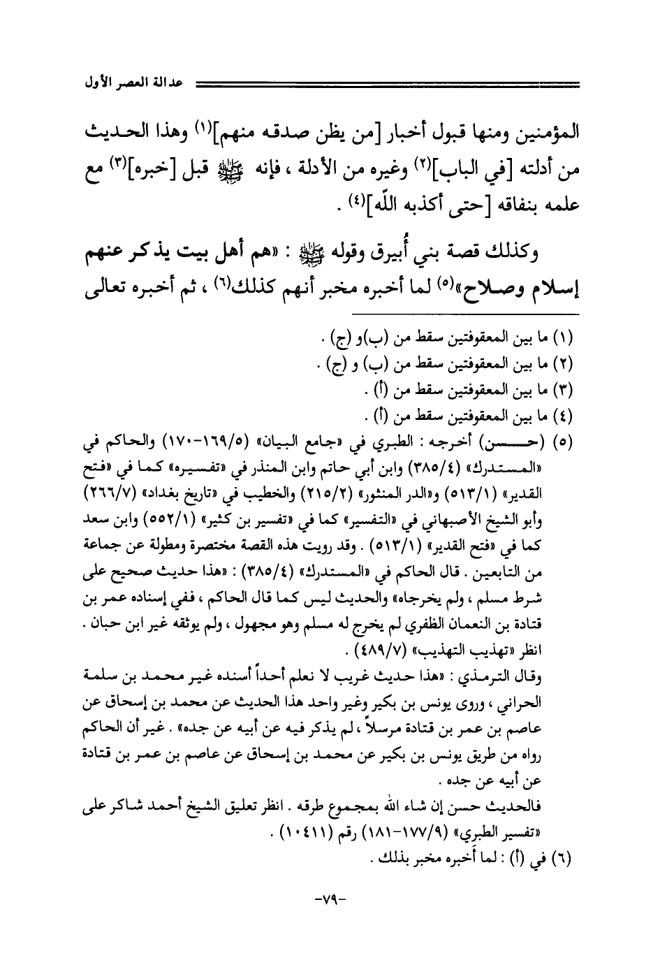 وَكَذَلِكَ قصَّة بني أُبَيْرِق وَقَوله صلى الله عَلَيْهِ وَسلم (هم أهل بَيت يذكر عَنْهُم إِسْلَام وَصَلَاح) لما أخبرهُ مخبر أَنهم كَذَلِك ثمَّ أخبرهُ تَعَالَى
