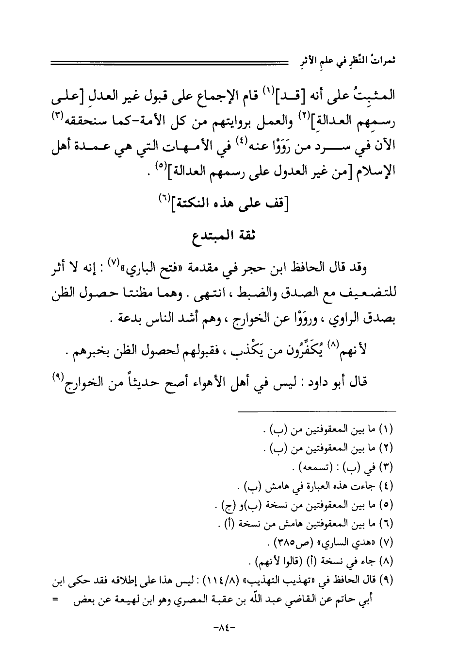 الْمُثبت على أَنه قد قَامَ الْإِجْمَاع على قبُول غير الْعدْل على رسمهم الْعَدَالَة وَالْعَمَل بروايتهم من كل الْأمة كَمَا سنحققه الْآن فِي سرد من رووا عَنهُ فِي الْأُمَّهَات الَّتِي هِيَ عُمْدَة أهل الْإِسْلَام من غير الْعُدُول على رسمهم الْعَدَالَة
