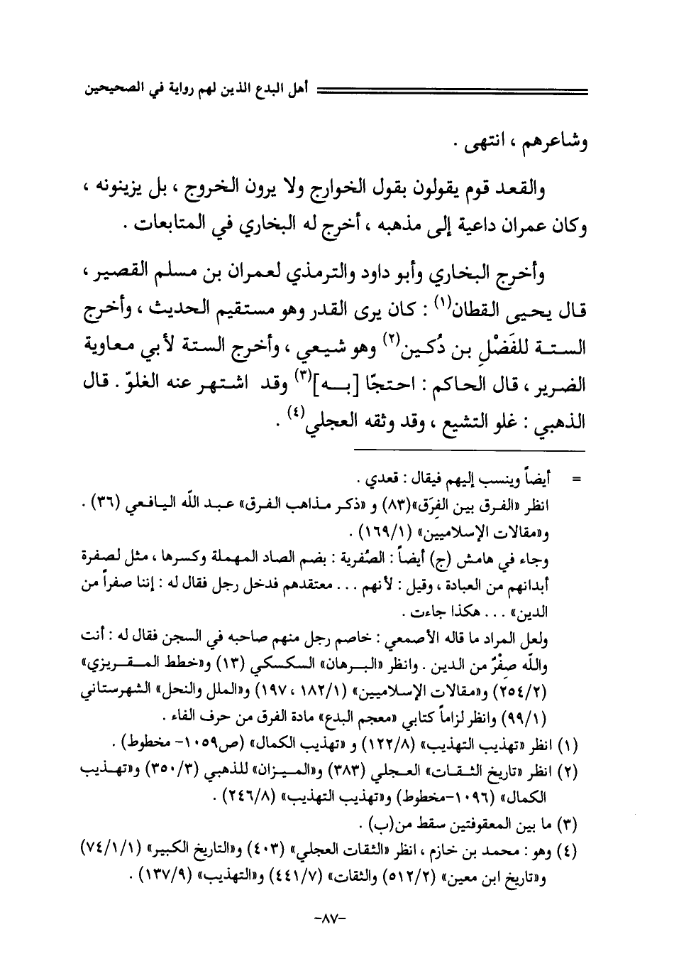وَأخرج البُخَارِيّ وَأَبُو دَاوُد وَالتِّرْمِذِيّ لعمران بن مُسلم الْقصير قَالَ يحيى الْقطَّان كَانَ يرى الْقدر وَهُوَ مُسْتَقِيم الحَدِيث وَأخرج السِّتَّة للفضل بن دُكَيْن وَهُوَ شيعي وَأخرج السِّتَّة لأبي مُعَاوِيَة الضَّرِير قَالَ الْحَاكِم احتجا بِهِ وَقد اشْتهر عَنهُ الغلو